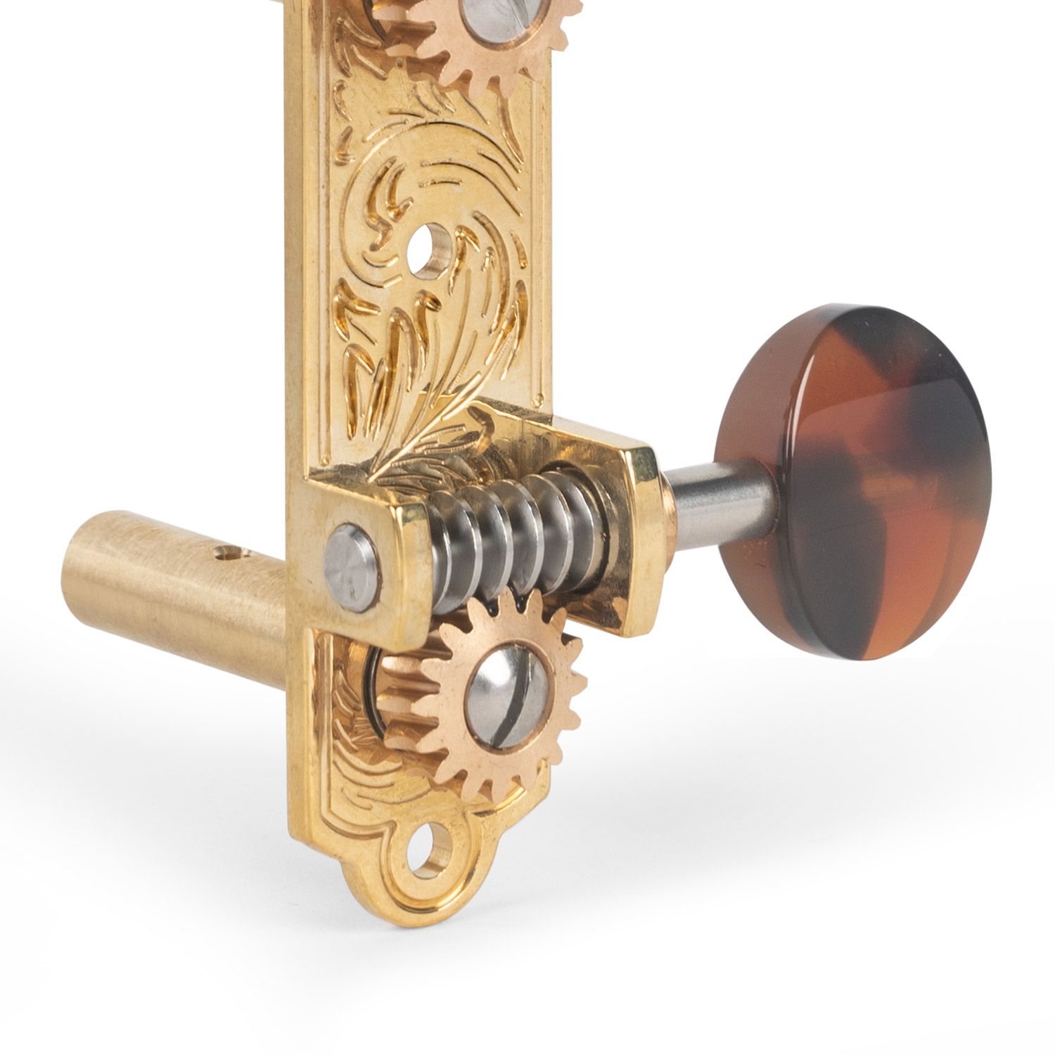 Für maximale Abstimmungsgenauigkeit verfügen unsere Präzisionsplatten- 16:1 Maschinen über dieselben Zahnräder und patentierte Schneckenbuchsen mit Gewinde, die auf allen Waverly-Maschinen zu finden sind. Die Messing-Stringpfosten sind für echte Eleganz und Stil auf polierten Messing-Basisplatten montiert.