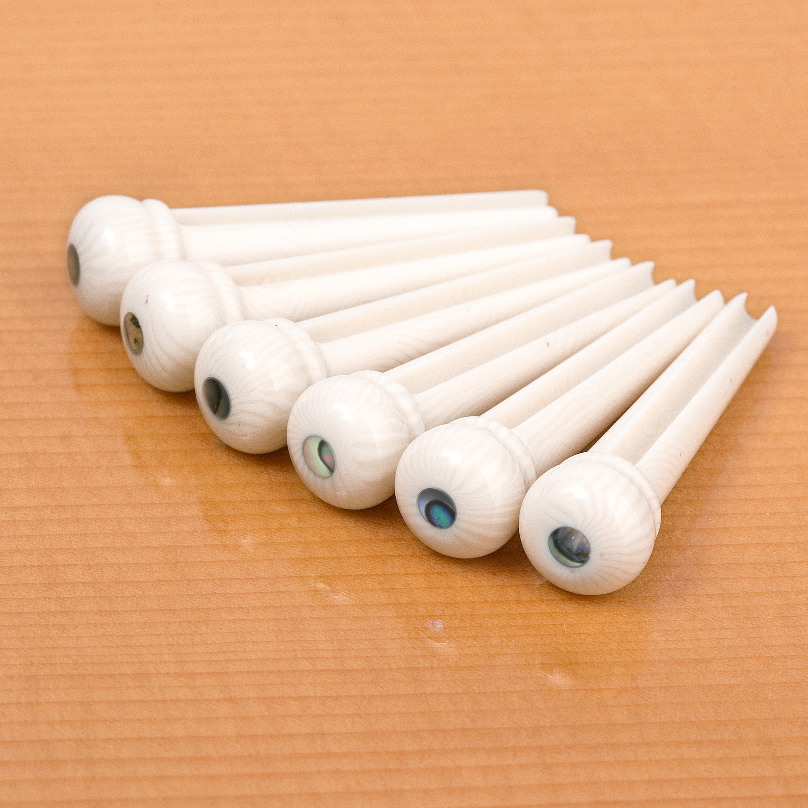 Unsere Ivoroid-Brückenstifte, Endstifte und Riemenknöpfe bestehen aus Galalith, ein dichtes und haltbares Material auf Kaseinbasis, das wunderschön poliert. Galalith ist im frühen 20. Jahrhundert beliebt und findet sich heute in Sammlerschmuck. Es kann nicht geformt werden; jeder Stift ist präzise bearbeitet und hat keine der unleichten Formlinien, die Kunststoffstiften gemein sind.