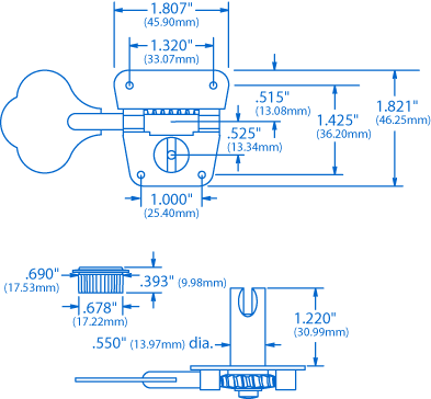 Bass-Tuner „Elephant ear“ mit gleichmäßigem 20:1 Übersetzungsverhältnis und geschlitzten Strangstiften. 11/16"-Durchmesser-Stiftlöcher erforderlich.