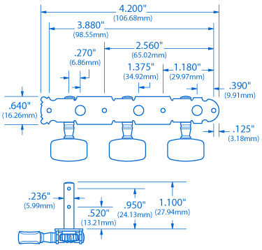 Sie sind vielseitig: Die 1/4" (6,35 mm) Durchmesser-Stringpfosten haben doppelte Löcher, sodass Sie diese Tuner auf massiven oder geschlitzten Steckköpfen installieren können. Vernickelt mit weißen Kunststoffknöpfen.1-3/8" (34,93 mm) Stringstiftabstand, 14:1 Übersetzungsverhältnis. Kompletter Satz von 3-links, 3-rechts. Befestigungsschrauben enthalten.