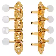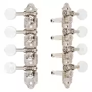 Gravierte Basisplatten aus Druckguss, 18:1 Übersetzungsverhältnis. Komplette Sätze von 4-linken/4-rechten Tunern mit gleich langen Knaufwellen und abnehmbaren Kunststoffknaufknöpfen aus Perlmutt.