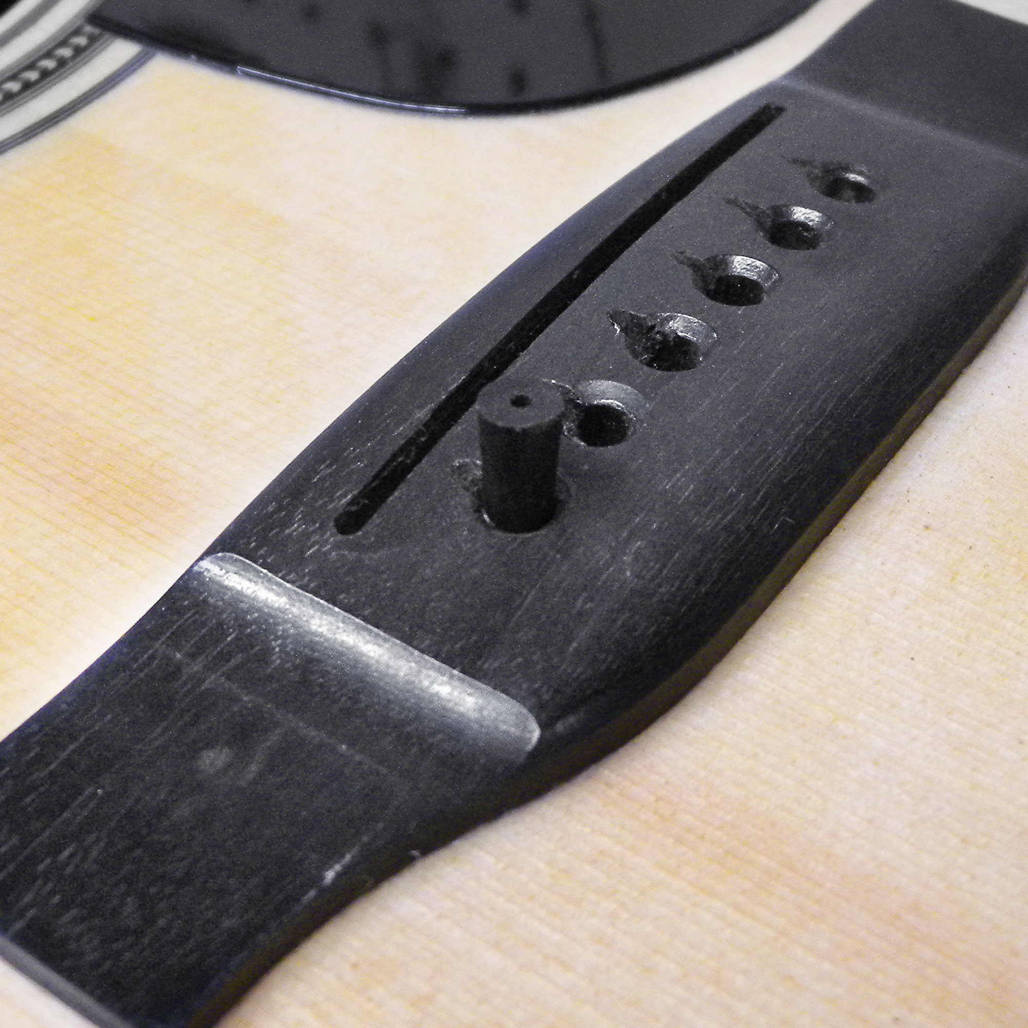 Eine akustische Brücke mit abgenutztem Brückenstiftloch kann schwer zu reparieren sein. Sie können das Loch ausfräsen und einen übergroßen Brückenstift verwenden, aber das sieht nicht gut aus und ist keine realistische Option für Sammlerinstrumente.