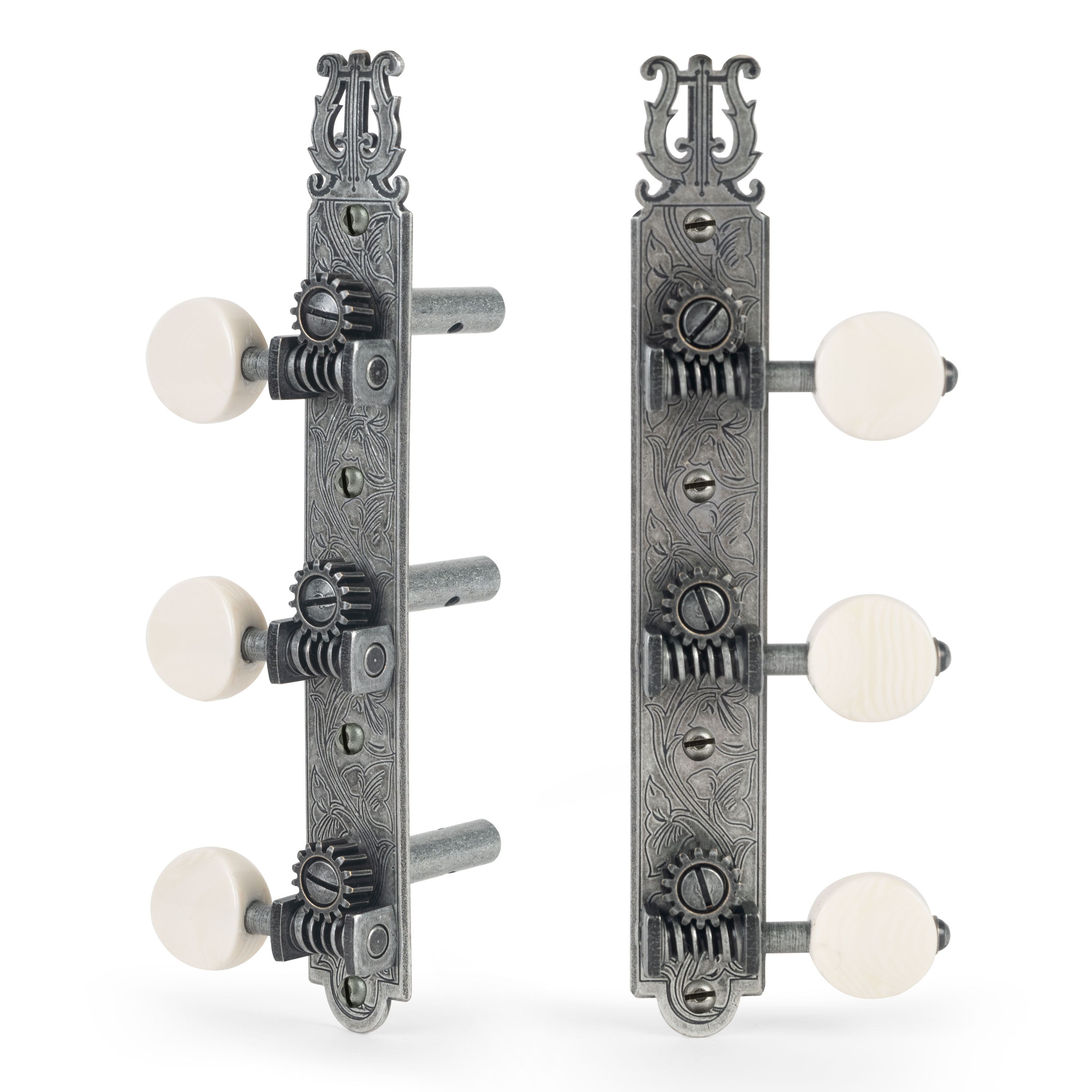 Die Grundplatten aus graviertem Stahl sind mit Lyre-Designs verziert, und die Schneckenräder sind in eckigen Stützen im alten Stil montiert. Diese Tuner verfügen auch über die „Wurm-under-Pfosten“-Rückwärtsschaltung, die Anfang des 20. Jahrhunderts beliebt war.
