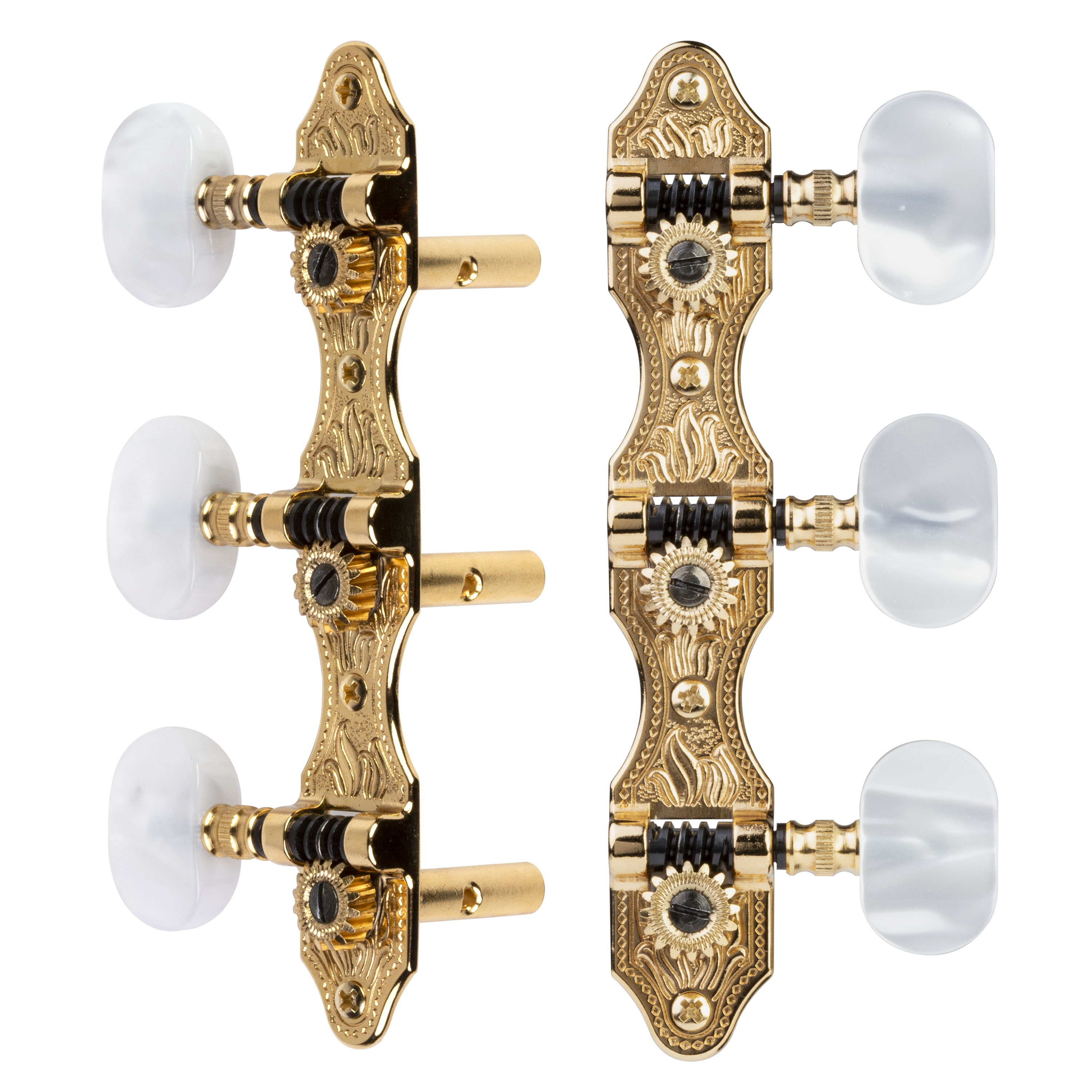Die Tuner verfügen über ein 16:1 Übersetzungsverhältnis, einen Abstand von 1-3/8"-Stringstiften und perlmuttartige Kunststoffknöpfe. Befestigungsschrauben enthalten. Stiftlöcher mit 10 mm Durchmesser erforderlich.