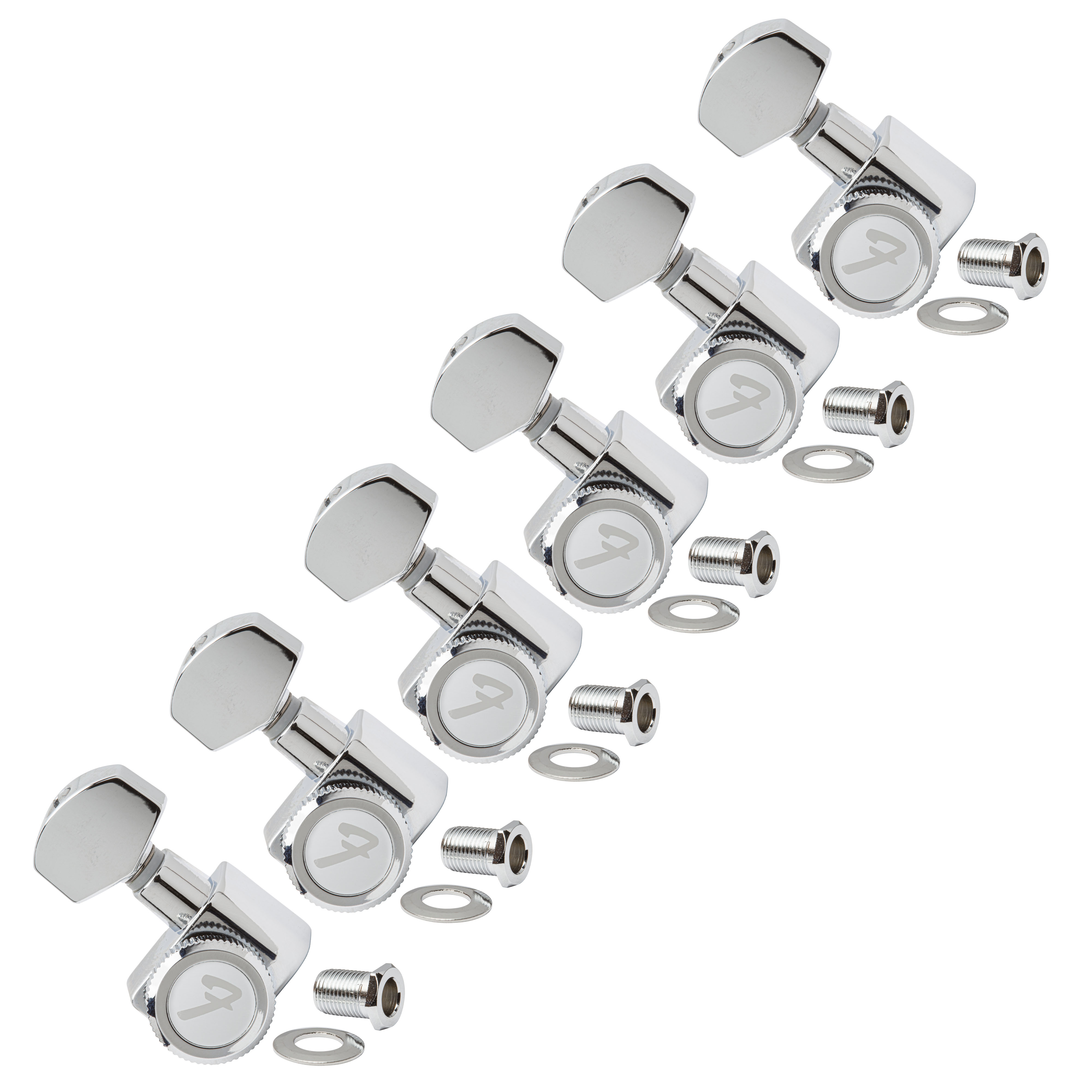 Satz mit sechs verriegelnden 6-in-Line-Tunern, die für die meisten modernen Fender-Elektrogitarren mit zweipoliger Montagekonfiguration entwickelt wurden. Für die Wundstränge werden hohe Post-Tuner und für die einfachen Stränge kürzere Post-Tuner verwendet. Gestaffelte Tuner erhöhen den Brechwinkel über der Mutter und verbessern die Abstimmungsstabilität.