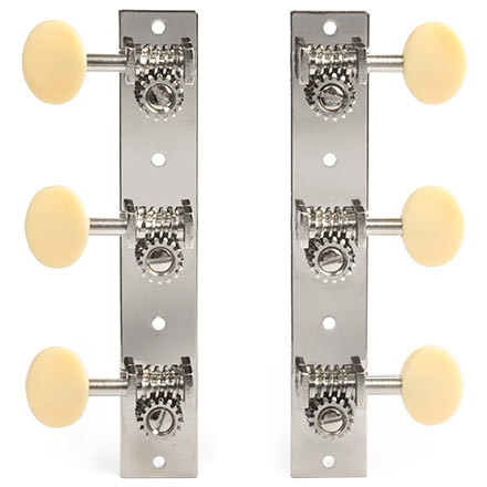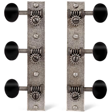 Exklusiv von Stewart-MacDonald, unseren 3-on-plate und quadratischen Schneckenstützen auf rechteckigen Stahlplatten. Ihr verbessertes 15:1 Übersetzungsverhältnis bietet eine bessere Abstimmung als die Originale, und unsere beliebte Relic-Nickel-Oberfläche ergänzt Vintage-Hardware.