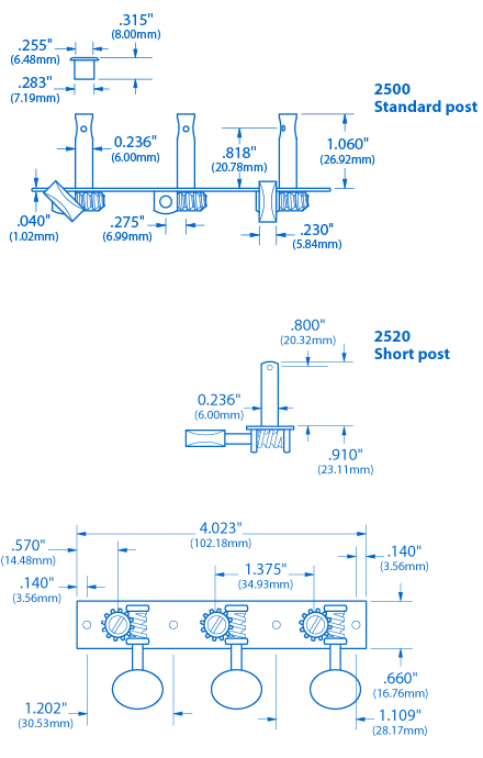 Kurze Streichsäulen sind ebenfalls erhältlich: Kurze Streichsäulen im Originalstil, die speziell für feste Pegheads mit konischer Dicke hergestellt wurden, wie z. B. Gibson® L-0, L-00, J-45, J-35 und Nick Lucas Gitarren.