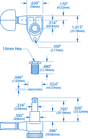 Ziehen Sie die Schnur durch das Abstimmloch, und mit einer Drehung des Daumenrads wird die Schnur in der Stange verriegelt. Nur ein paar Umdrehungen des Tunerknopfs und ihr könnt nicken. Da es nur eine teilweise Umhüllung der Schnur um den Pfosten gibt, wird die Abstimmungsstabilität drastisch verbessert. Locking Tuner eignen sich hervorragend für nicht-locking Tremolo-Gitarren und für Spieler, die sich stark biegen.
