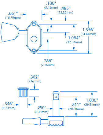 Sie verfügen über Nylon-Schneckenlager für einen reibungslosen Betrieb, 15:1 Übersetzungsverhältnis für präzise Abstimmung und wartungsfreie abgedichtete Schmierung.Sets mit 6 (3-links/3-rechts), mit Schrauben und Presspassbuchsen. 11/32"-Stiftlöcher erforderlich. Erhältlich mit Knaufknöpfen aus Kunststoff oder Metall.