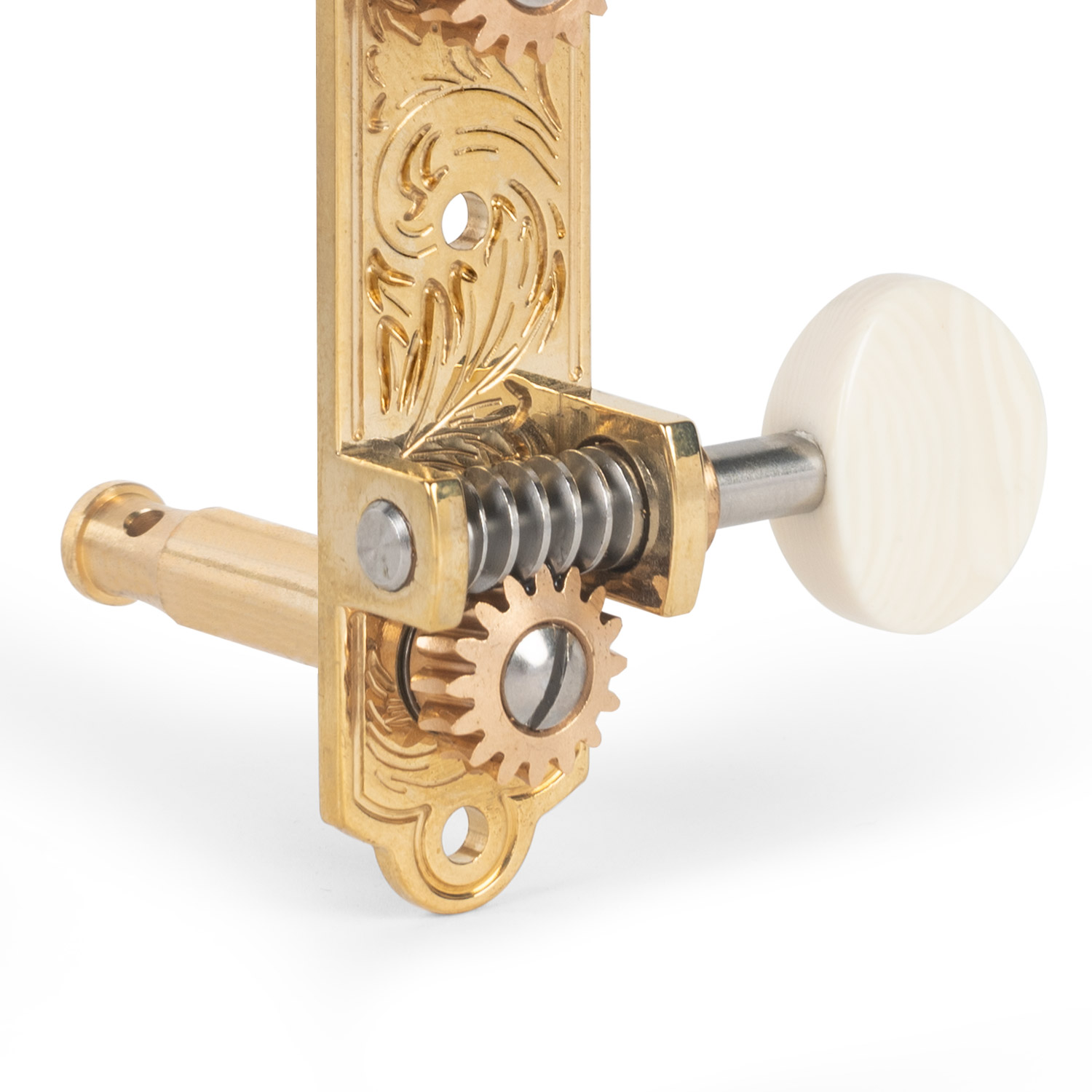 Die Ivoroid-Knöpfe ähneln dem echten Elfenbein, sind aber eine langlebige, nicht-tierische Alternative. Das Tuner-Set umfasst geschlitzte Rundkopf-Montageschrauben und gerändelte Press-Fit-Steckbuchsen.
