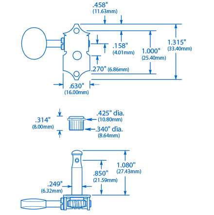 Waverly-Tuner verfügen über konische Strangstangen mit 1/4 Zoll Durchmesser und die Press-Fit-Innensechskantbuchsen aus Messing passen für 11/32 Zoll Durchmesser-Stiftlöcher. Schrauben enthalten.