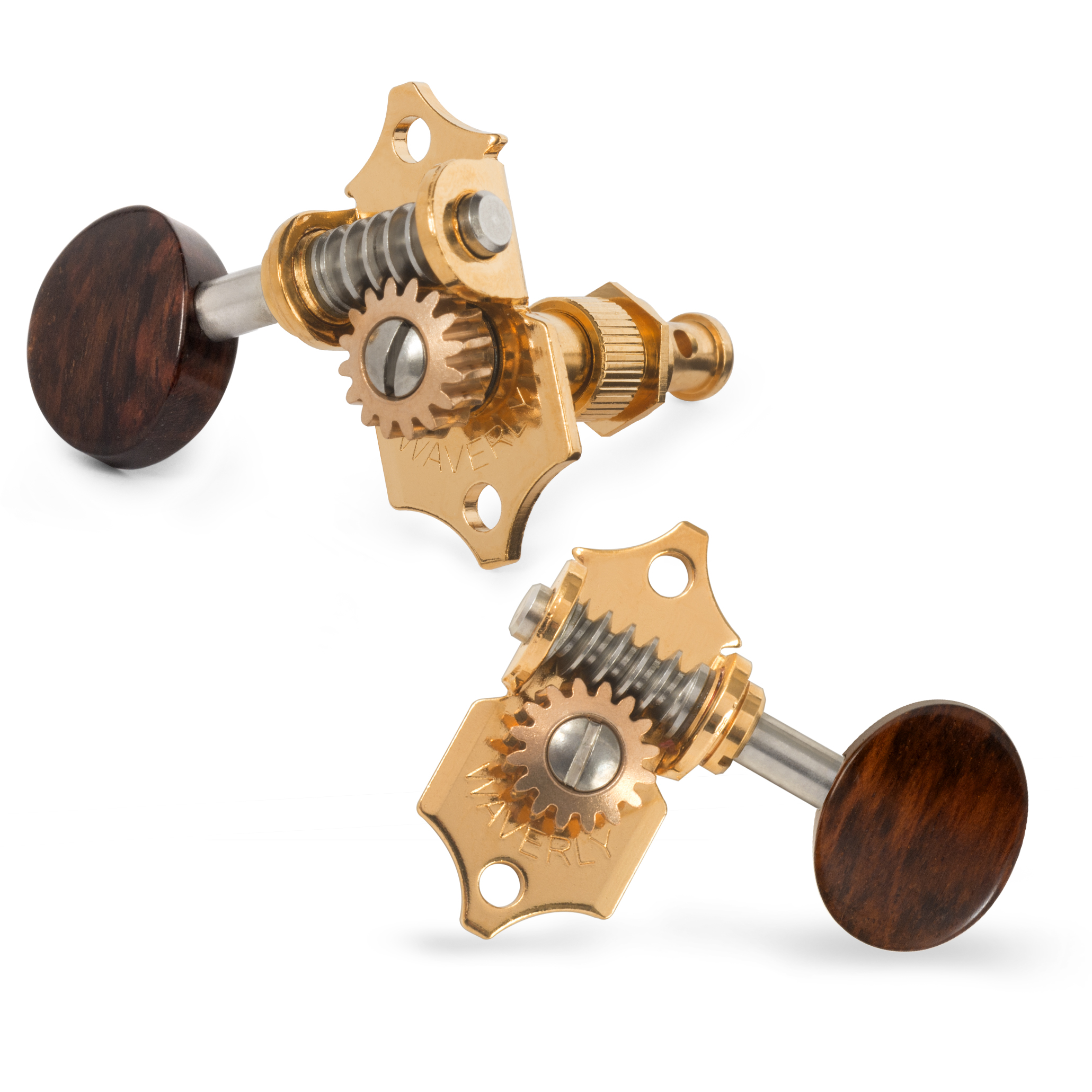 Waverly Tuner verfügen über konische, 1/4"-Durchmesser-Stringpfosten und die Press-Fit Messing-Sechskantbuchsen passen für 11/32"-Durchmesser-Pegholes. Satz mit 6 Tunern, 3 links/3 rechts, Schrauben enthalten.