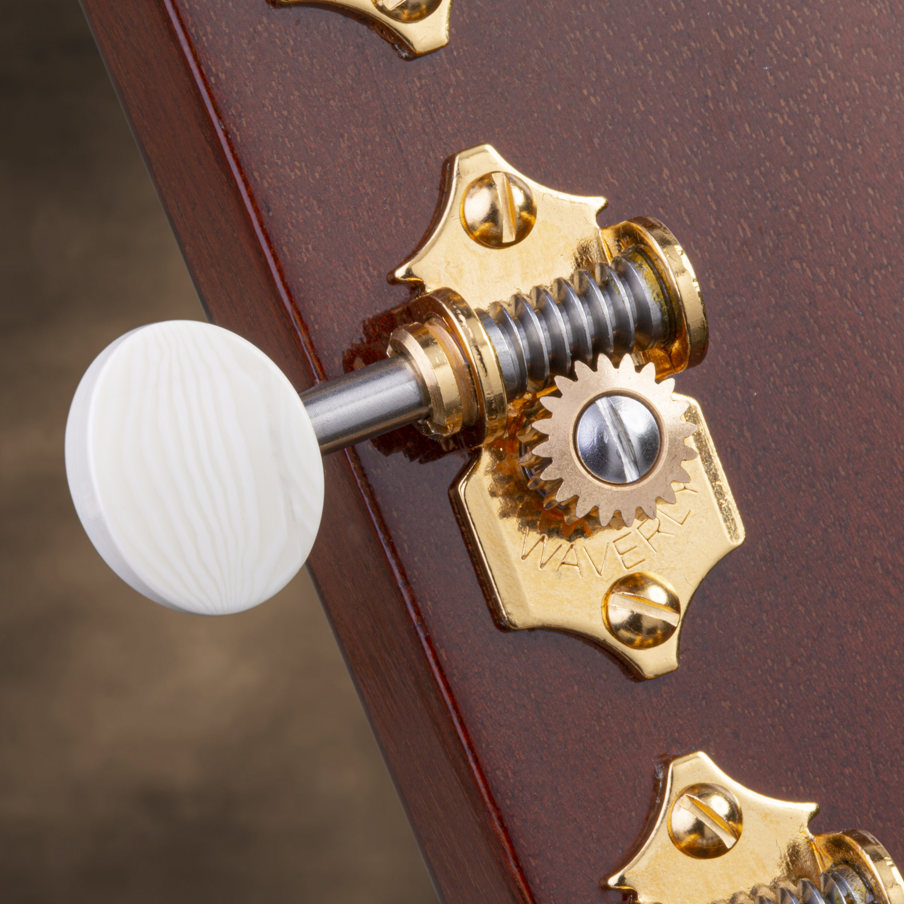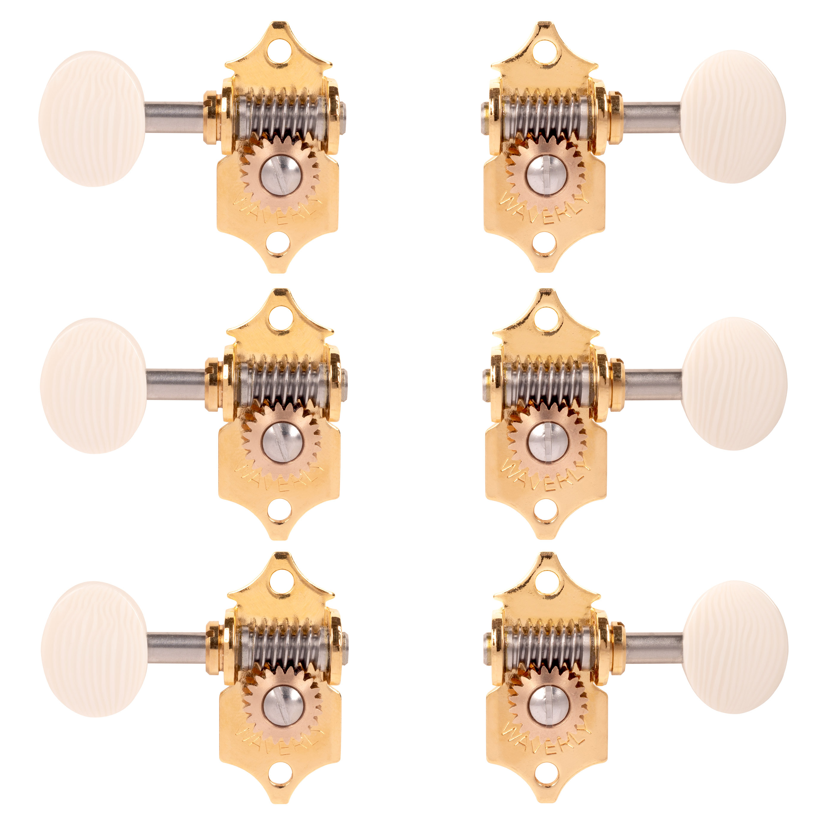 Waverly Tuner stehen für den Höhepunkt des cleanen, eleganten Designs. Die Ivoroid-Knöpfe haben das einzigartige Aussehen von echtem Elfenbein, sind aber eine langlebige nicht-tierische Alternative. Die Stellfläche ist die gleiche wie die des sagenumwobenen Martins aus der Vorkriegszeit, was die Installation nahtlos macht. Diese Tuner sind auf einem Fischgrätmuster ebenso optisch auffällig wie ein modernes elektrisches Meisterwerk.