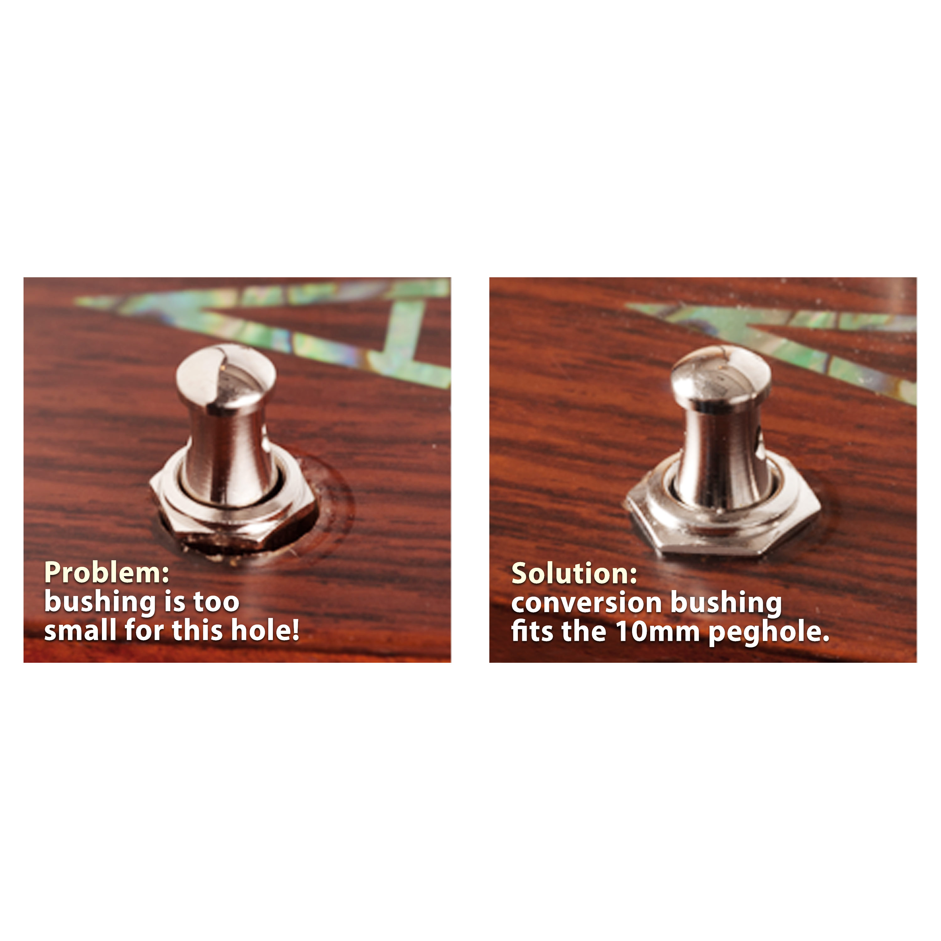 Hinweis: Diese Konvertierungsbuchsen funktionieren nicht bei Instrumenten mit 10,5 mm Zapfenlöchern. Messen Sie vor der Bestellung den Durchmesser des Tunerlochs.