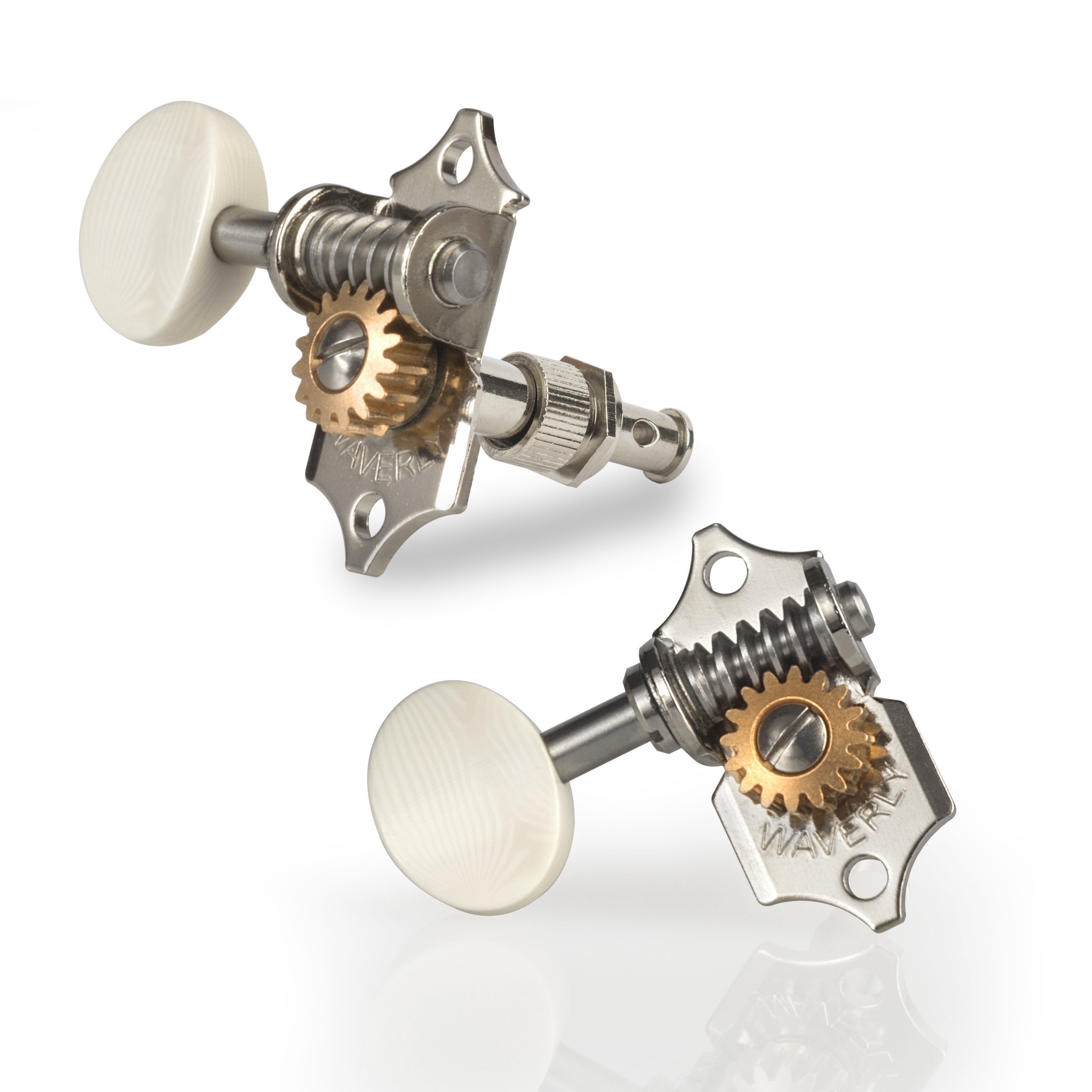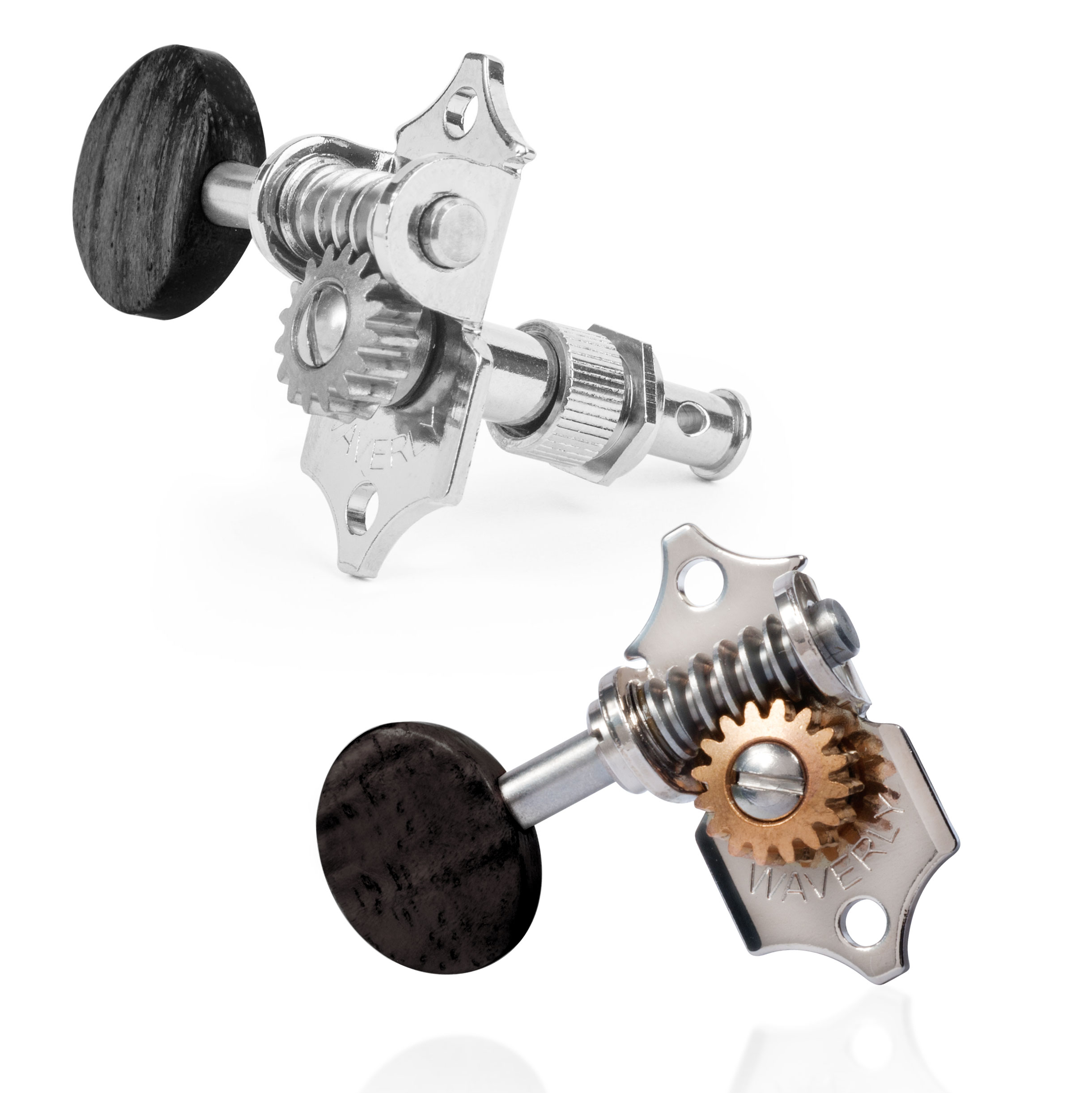 Glattere, effizientere Abstimmung. Waverlys bekannter 16:1 Getriebemechanismus ist unübertroffen. Waverly-Stimmmechaniken verfügen über eine bewährte, präzise gefertigte Konstruktion, die eine genaue und effiziente Ausrichtung der Zahnräder gewährleistet. Schneckengetriebebuchsen aus Nylon sorgen für ein geschmeidiges Drehgefühl. Das Ergebnis: Lockerheit wird beseitigt – Ihr Gerät spielt in der Melodie und bleibt in der Melodie.