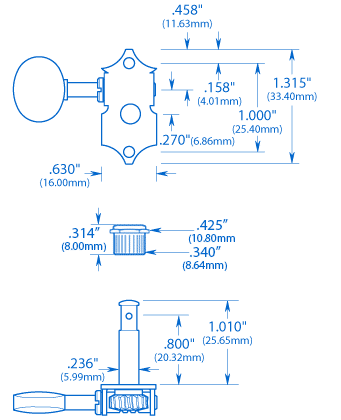 - Stringpfosten sind aus Messing mit einem Durchmesser von 1,01" x 0,236" (25,7 mm x 6,0 mm) für massive Ukulele-Stiftköpfe mit einer Dicke von bis zu 9/16" (14,3 mm)