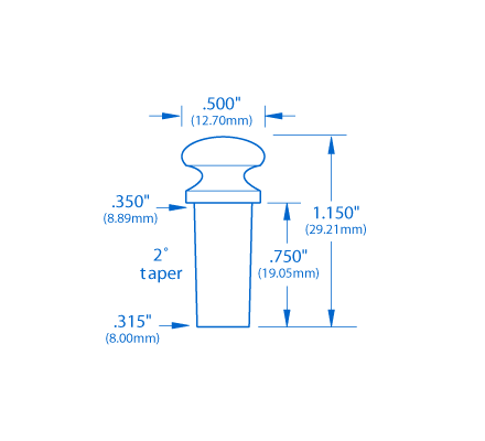 Der ivoroide Endpin besteht aus Galalith, ein dichtes und langlebiges Material auf Kaseinbasis, das wunderschön poliert. Es kann nicht geformt werden; jeder Stift ist präzise bearbeitet und hat keine der unansehnlichen Formlinien, die Kunststoffendstiften gemein sind.Der 3/4" lange (19,05 mm) Schaft hat einen 2-Grad-Konus von etwa 8,89 mm bis 8,00 mm (0,350" bis 0,315") Durchmesser.