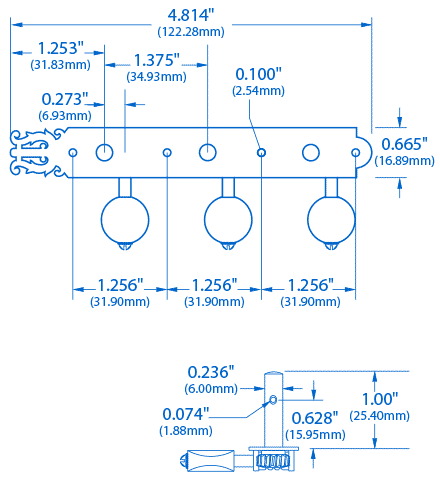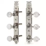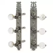 Die Grundplatten aus graviertem Stahl sind mit Lyre-Designs verziert, und die Schneckenräder sind in eckigen Stützen im alten Stil montiert. Diese Tuner verfügen auch über die „Wurm-under-Pfosten“-Rückwärtsschaltung, die Anfang des 20. Jahrhunderts beliebt war.