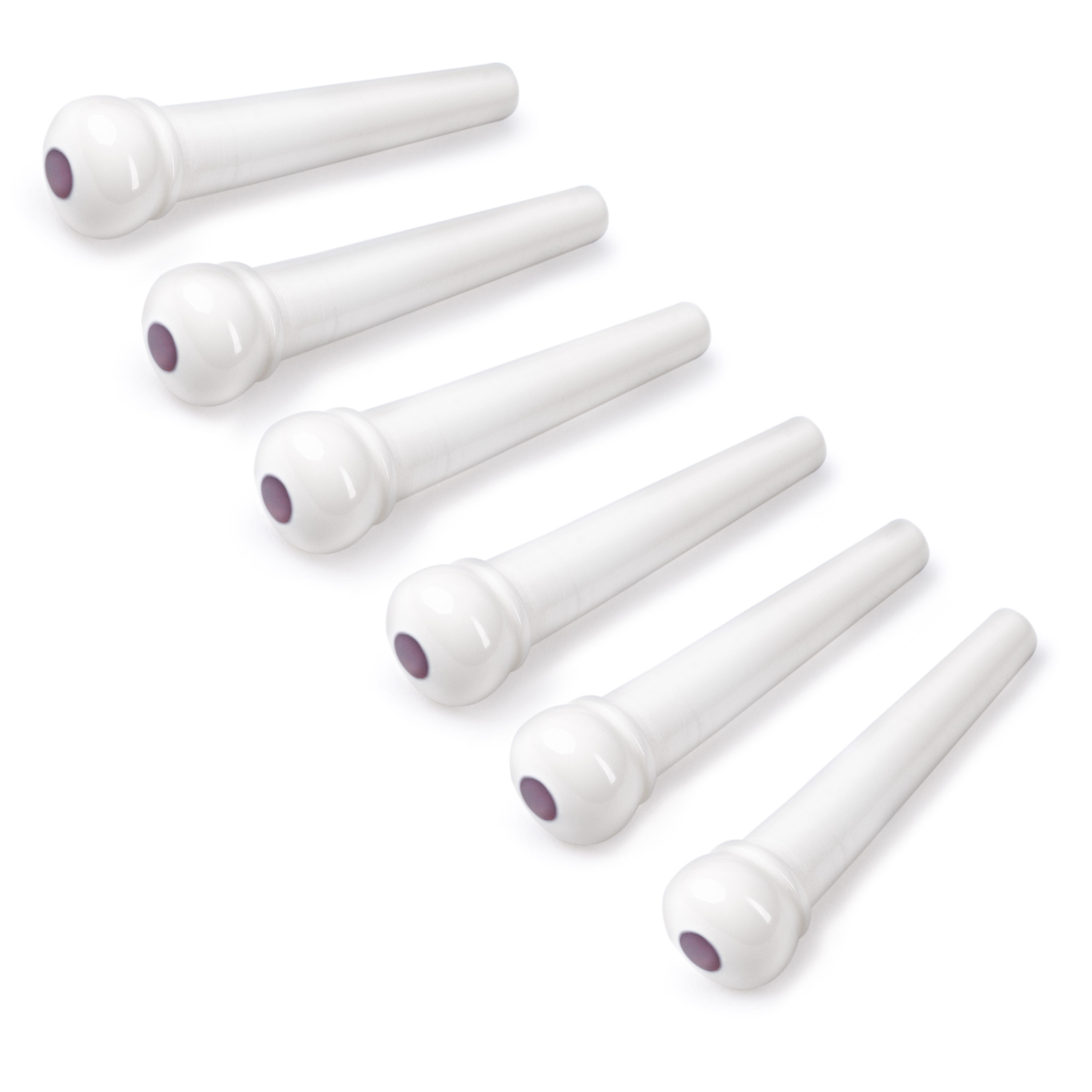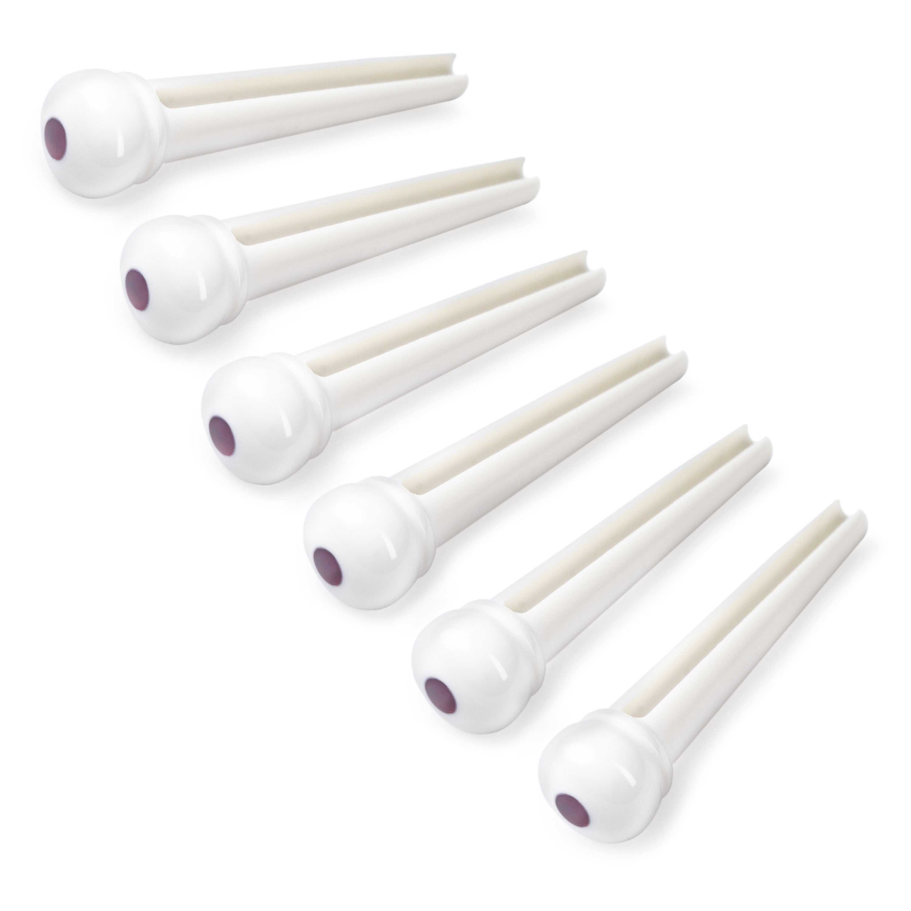 Alle Stifte haben einen 5-Grad-Konus. Die geschlitzten Stifte haben einen 0,070" (1,78 mm) Strangschlitz. Übergroße Stifte sind für abgenutzte Brückenstiftlöcher dicker. Verkauft in Sätzen von 6 Stück.