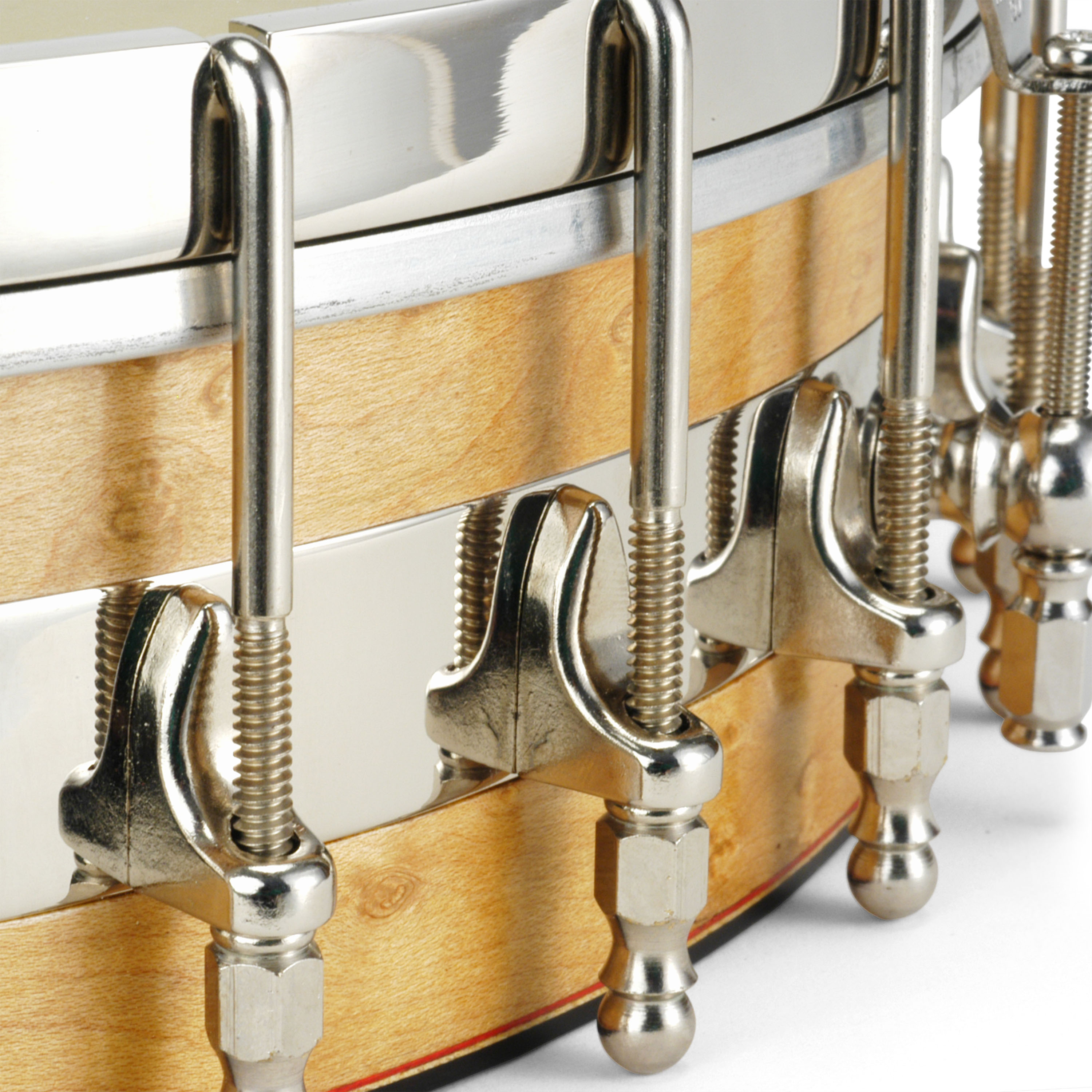 Traditionelle Hardware für Banjo. Dieser attraktive L-Schuh aus vernickelter Zinklegierung hält einen Halterungshaken an der Seite eines Banjo-Felgens.