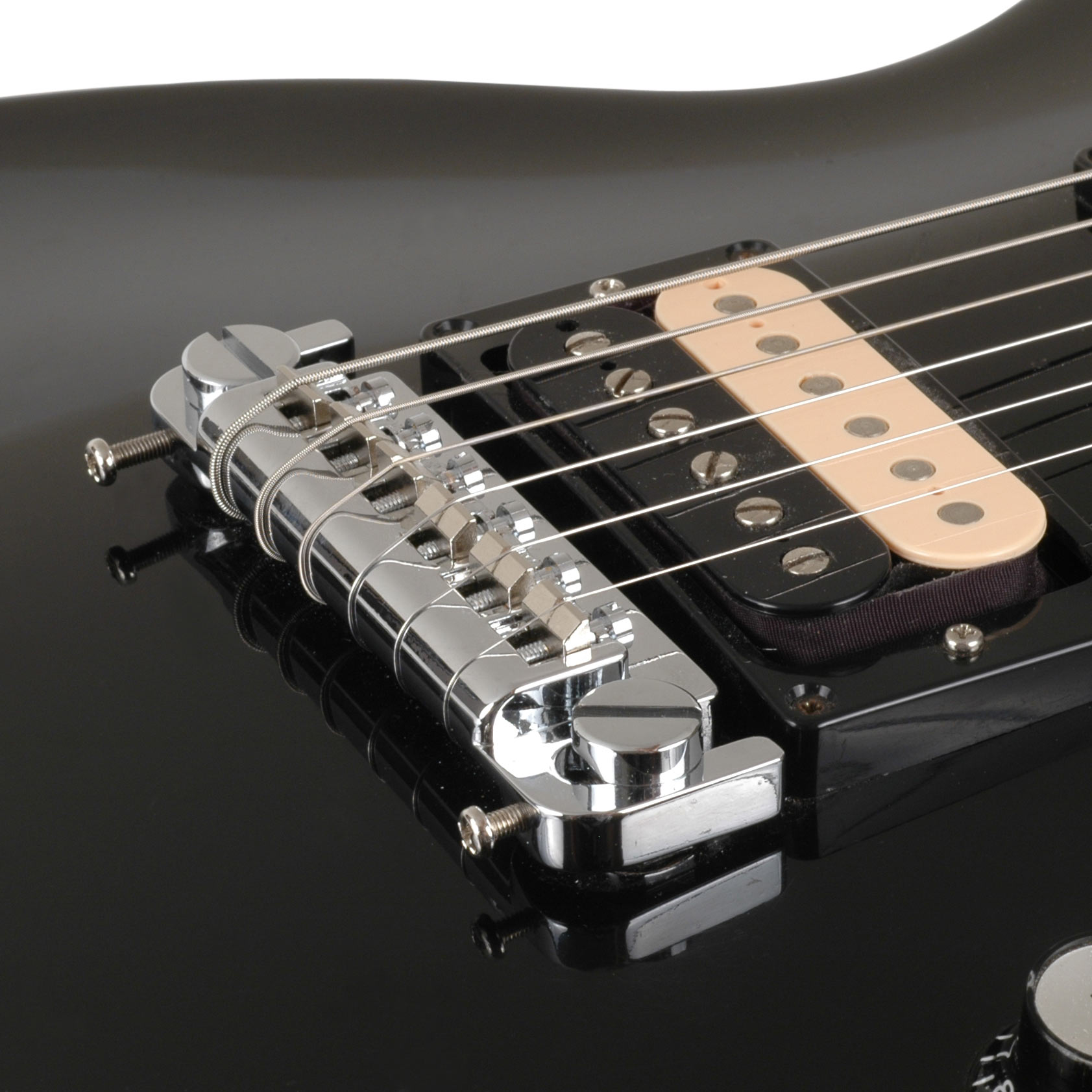 Zwei Ausrichtungsschrauben passen die gesamte Intonation an. Die höhenverstellbaren Montagebolzen beinhalten Rändelbuchsen. Die Saiten werden von der Vorderseite der Druckgussbasis geladen, über die Rückseite der Brücke und über die gekerbten Sättel gewickelt. Bohren Sie 7/16" (11 mm) Löcher für die Buchsen.