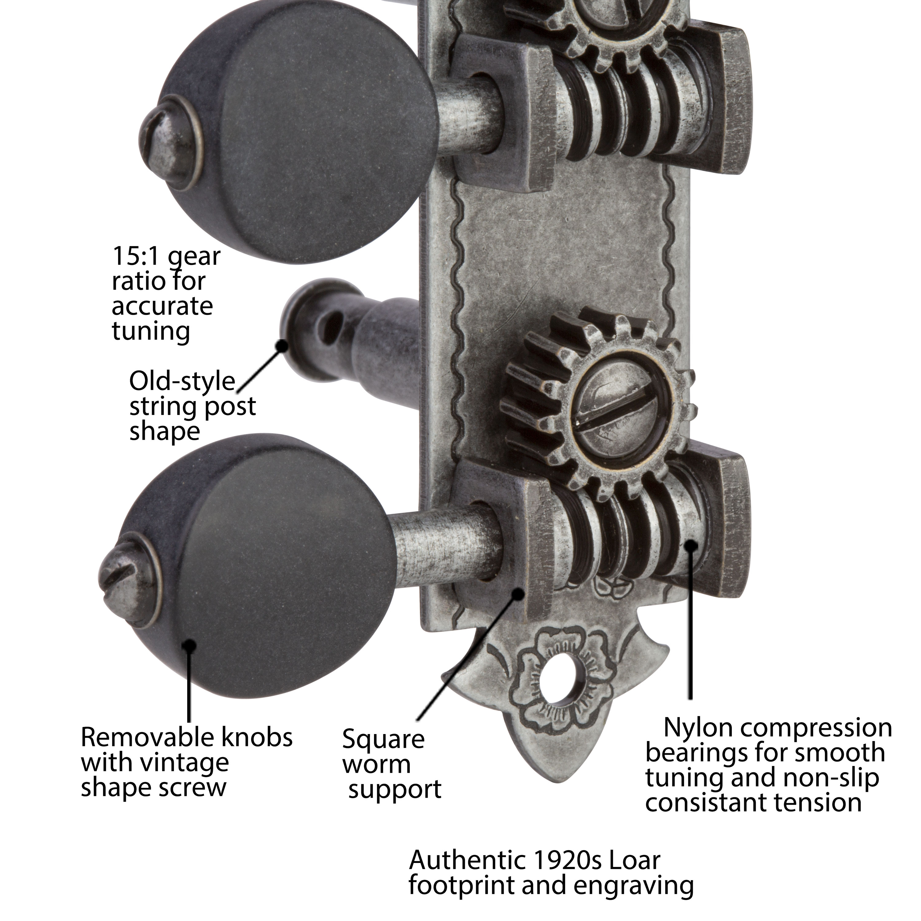 Der Look ist authentischer als je zuvor, aber die engen Toleranzen, Nylon-Schneckenlager und 15:1 das Übersetzungsverhältnis machen die Golden Age Tuner glatter und effizienter als Vintage-Maschinen je. Zwei optionale Relikte veredeln die „gut gespielte“ Patina, die die meisten anderen modernen Tuner auf einem Vintage- oder Reproduktionsinstrument neu aussehen lässt. Die markanten Loar-Shape-Stahlgrundplatten haben sogar die gleiche Grundfläche und Gravur wie 1920er Originale.