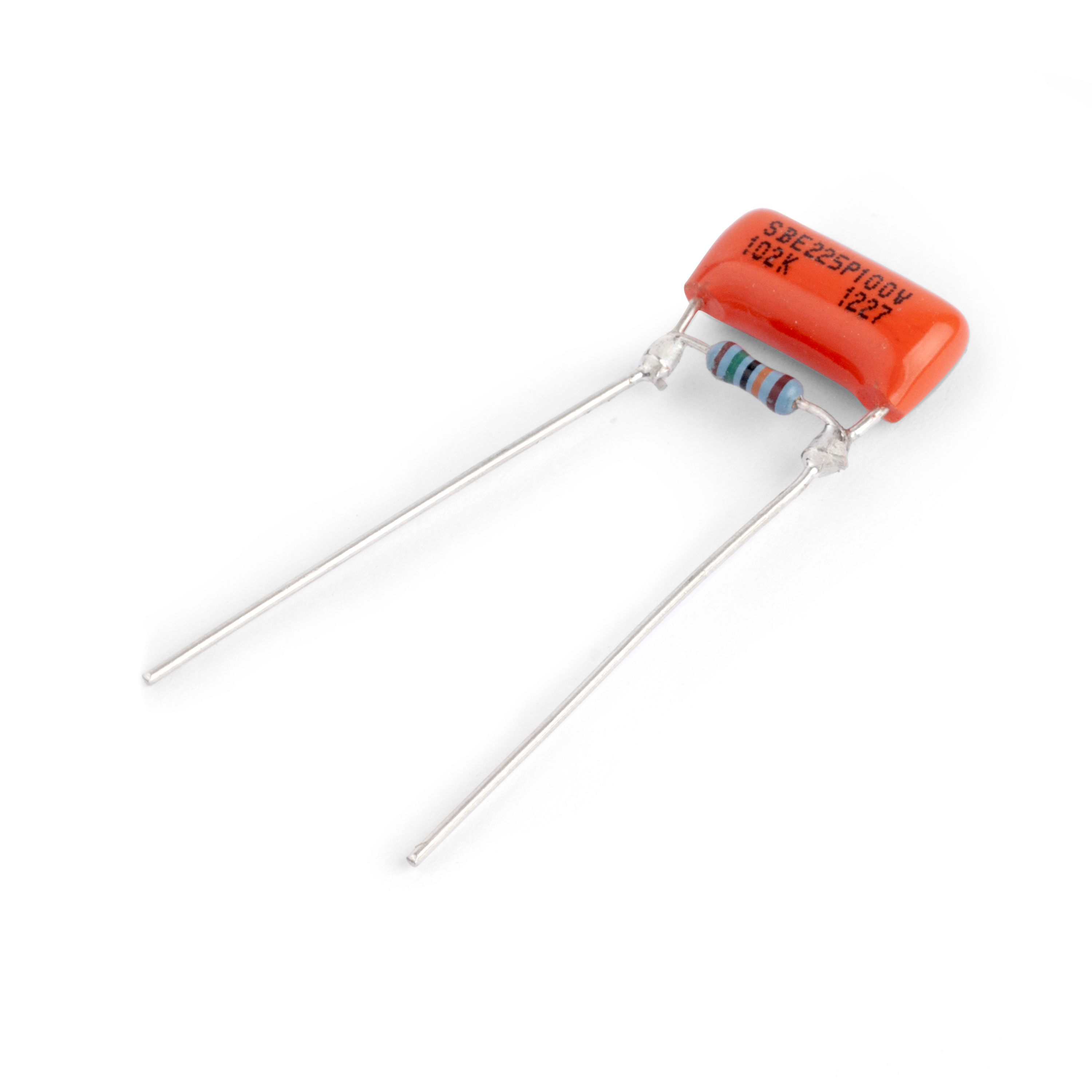 Handgelötet hier in unserer Werkstatt: ein Widerstand 1,0-K-ohm 1/4-watt (1% Toleranz) parallel zu einem Kondensator 0,001uF . Verdrahten Sie diese einfache Mod zwischen den Eingangs- und Ausgangsösen Ihres Gitarrenvolumenreglertopfs, um eine dreifache Entlüftung zu glätten. Erhalten Sie einen gleichmäßigeren Ton von 1 bis 10 und einen runderen Klang bei geringer Lautstärke. Erhältlich mit Keramik- oder Orange Drop®-Kondensator.Hören Sie den Unterschied in TradeSecrets Ausgabe 182.