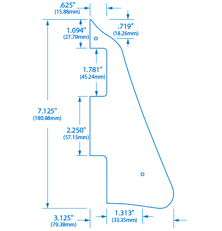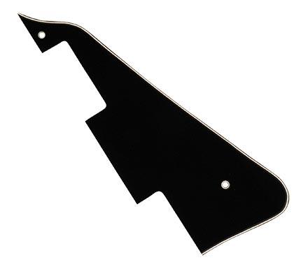 Der schwarz/weiß/schwarze Pickguard hat eine abgeschrägte Kante, um die Laminierungen freizulegen, und die Cremeversion hat die ursprüngliche quadratische Kante. Beide haben eine glänzende Oberfläche und Senkschraubenlöcher.Die Halterung ist 2-1/4" x 1" (57,15 mm x 25,40 mm). Das Montageloch befindet sich 3/4" (19,05 mm) an der Seite der Halterung. Der obere Montageschlitz der Halterung ist 1/8" x 1-1/8" (3,18 mm x 28,58 mm).
