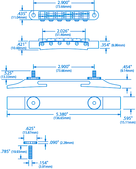 Die Höhe ist mit dem Daumenrad von etwa 7/8" bis 1-1/4" (22,23 mm bis 31,75 mm) einstellbar. Die Sättel sind vorgeschlitzt und einstellbar, um eine genaue Zeichenfolgentonation einzustellen.