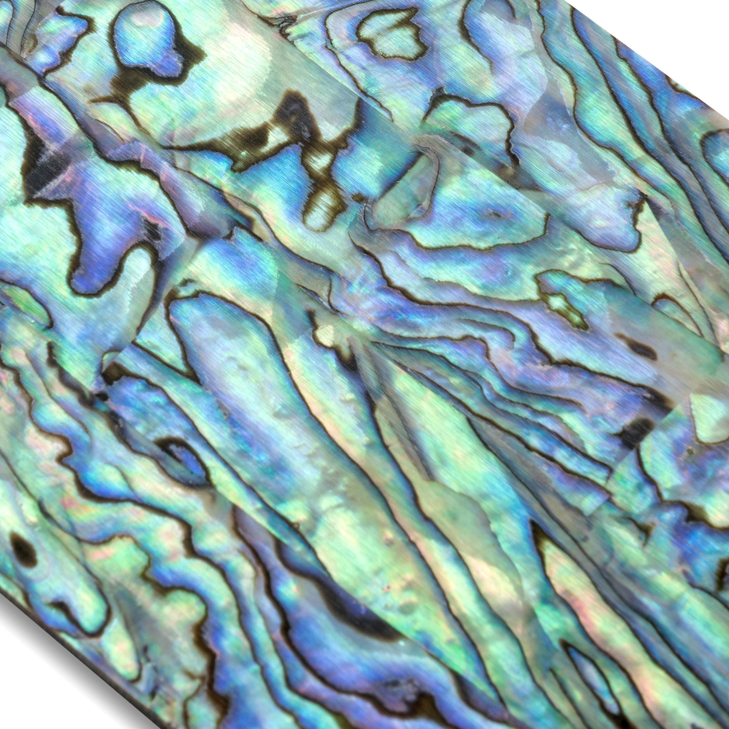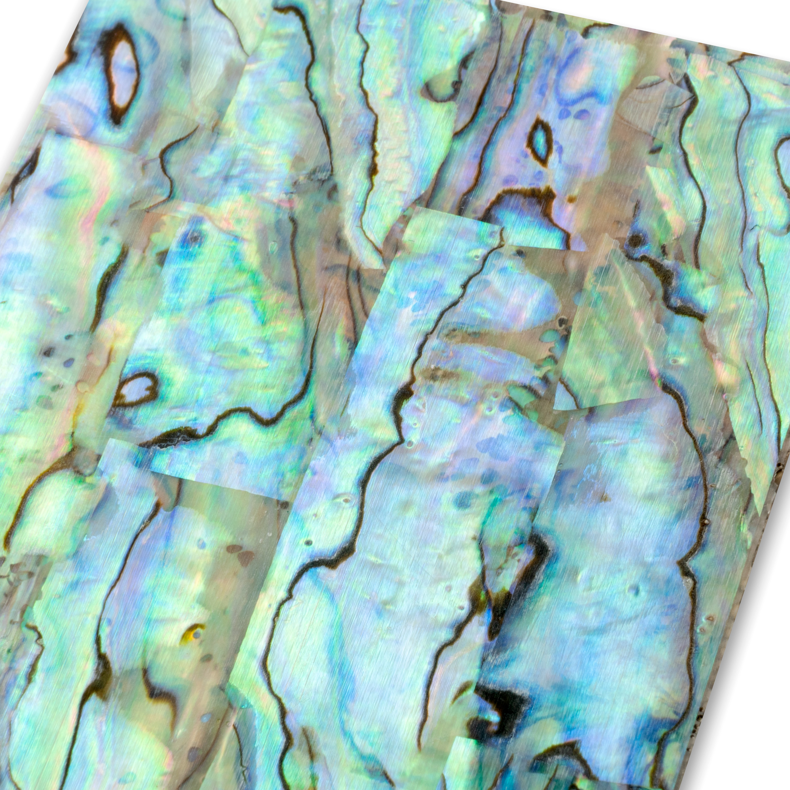 Echte Paua-Abalone-Hülle in dünnen, epoxidgebundenen Schichten. Jede Schicht ist ein Patchwork aus kleineren, farblich abgestimmten Teilen.