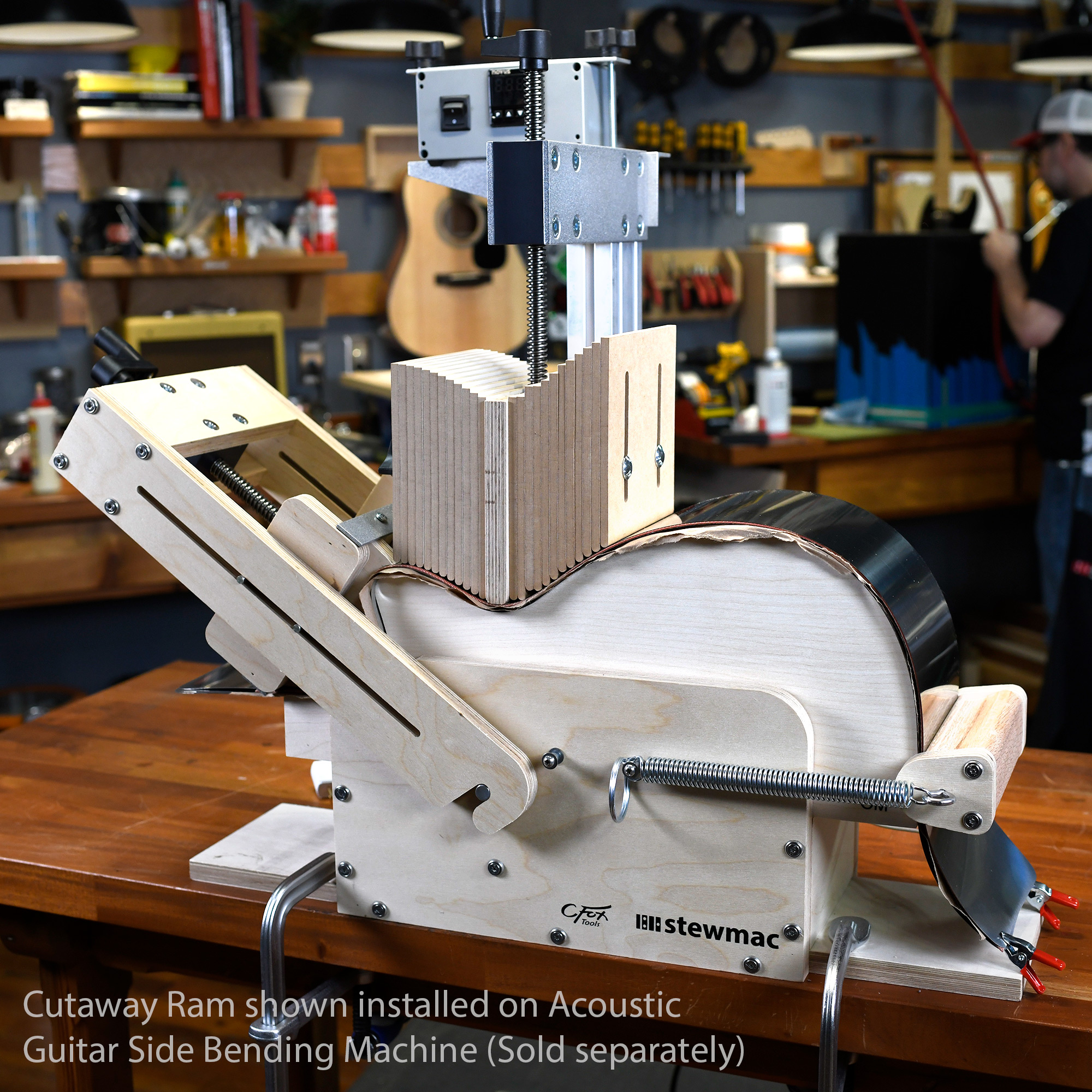 Der Cutaway Ram macht unsere Seitenbiegezange sofort noch vielseitiger, ohne dass Änderungen erforderlich sind. Sie können Schnitt- und Nicht-Schnittformen in Sekunden ändern. Es ist nur ein Schritt, ihn auf dem Bender zu installieren, und du bist bereit, eine völlig andere Gitarre zu bauen.