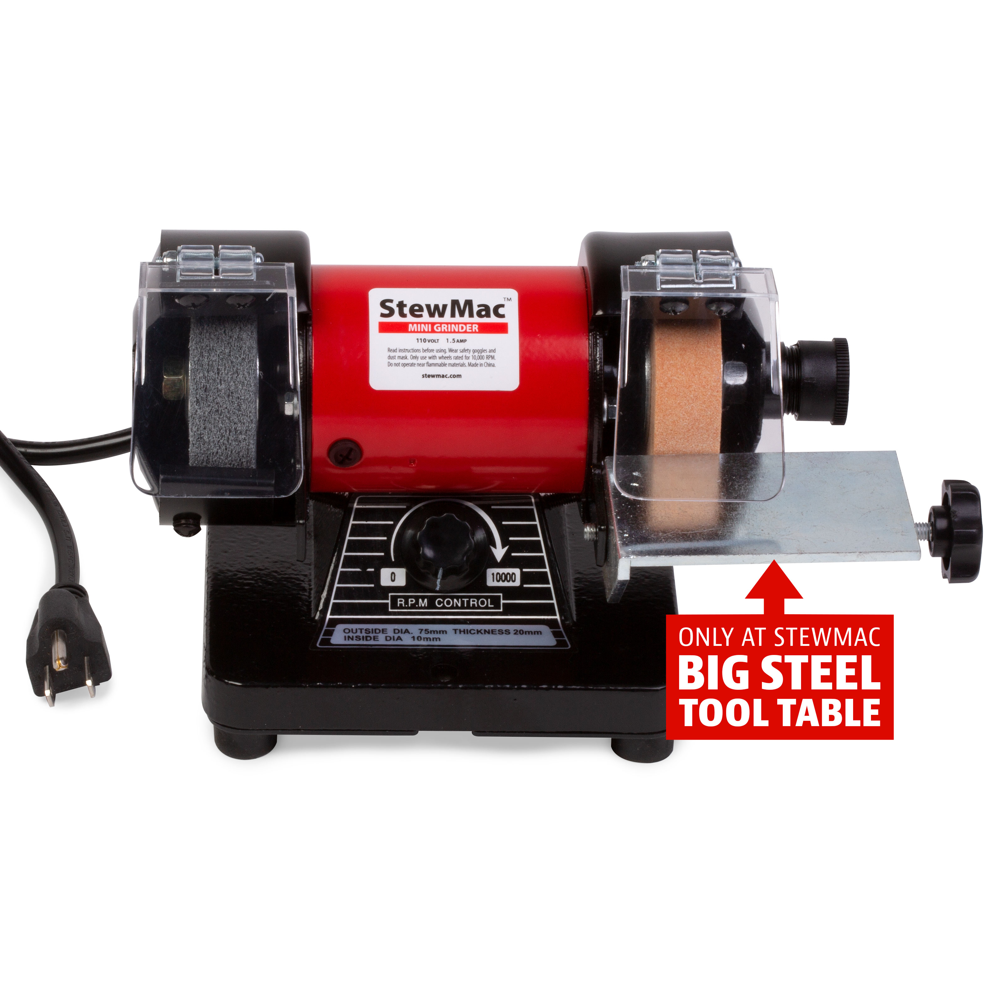 Wir haben unsere Mini-Schleifmaschine mit einem speziellen Stahltisch ausgestattet, der speziell als Halterung für die Ultimate Scraper beim Schärfen gedacht ist. Diese robusten Schaber sind dicker als herkömmliche Schaber und aufgrund ihrer zwei Schneidkanten ist es nicht ganz einfach, sie zu schärfen. Wenn du unsere Ultimate Scraper verwendest, ist unsere Mini-Schleifmaschine genau das Richtige für dich, um die Kanten schnell und präzise zu schleifen.