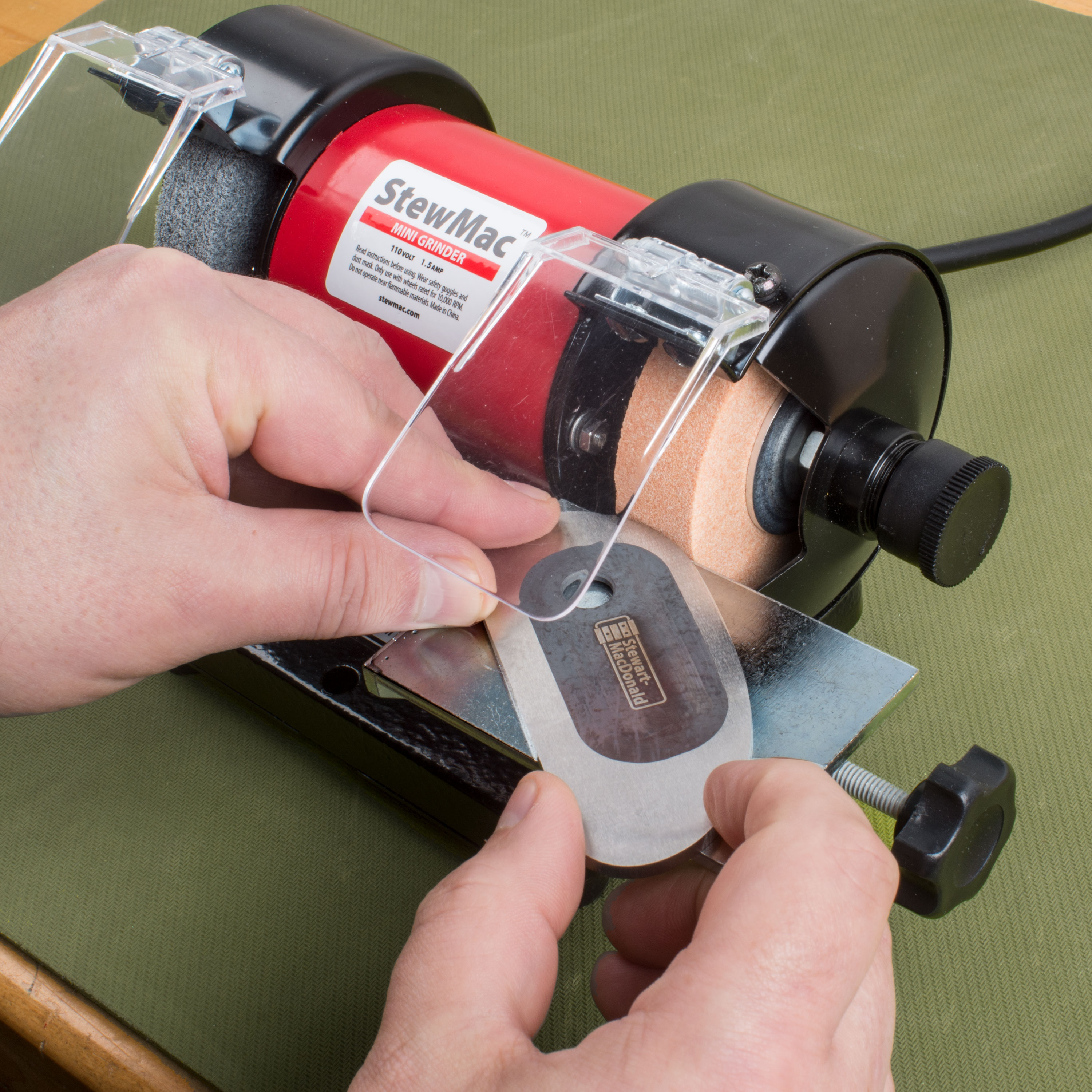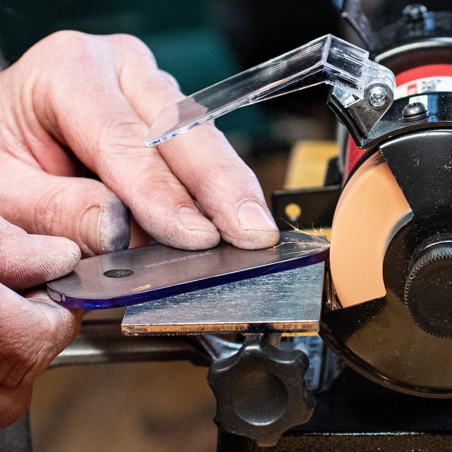 Das Schärfen unserer Ultimate Scraper war noch nie so einfach: Lege den Schaber mit der Schneide nach unten auf den großen Tisch und ziehe die Kante langsam und locker über die Scheibe – in wenigen Sekunden ist er scharf und wieder einsatzbereit. Eine Anleitung zum Einrichten der Schleifmaschine und zum Schärfen ist im Lieferumfang enthalten.