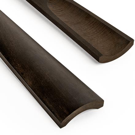 Ebenholz in feiner Qualität, getrocknet, auf 4/4 er-Größe mit gewölbter Spielfläche bearbeitet. 10-11/16" (271,46 mm) lang und 1" (25,40 mm) breit an der Mutter.