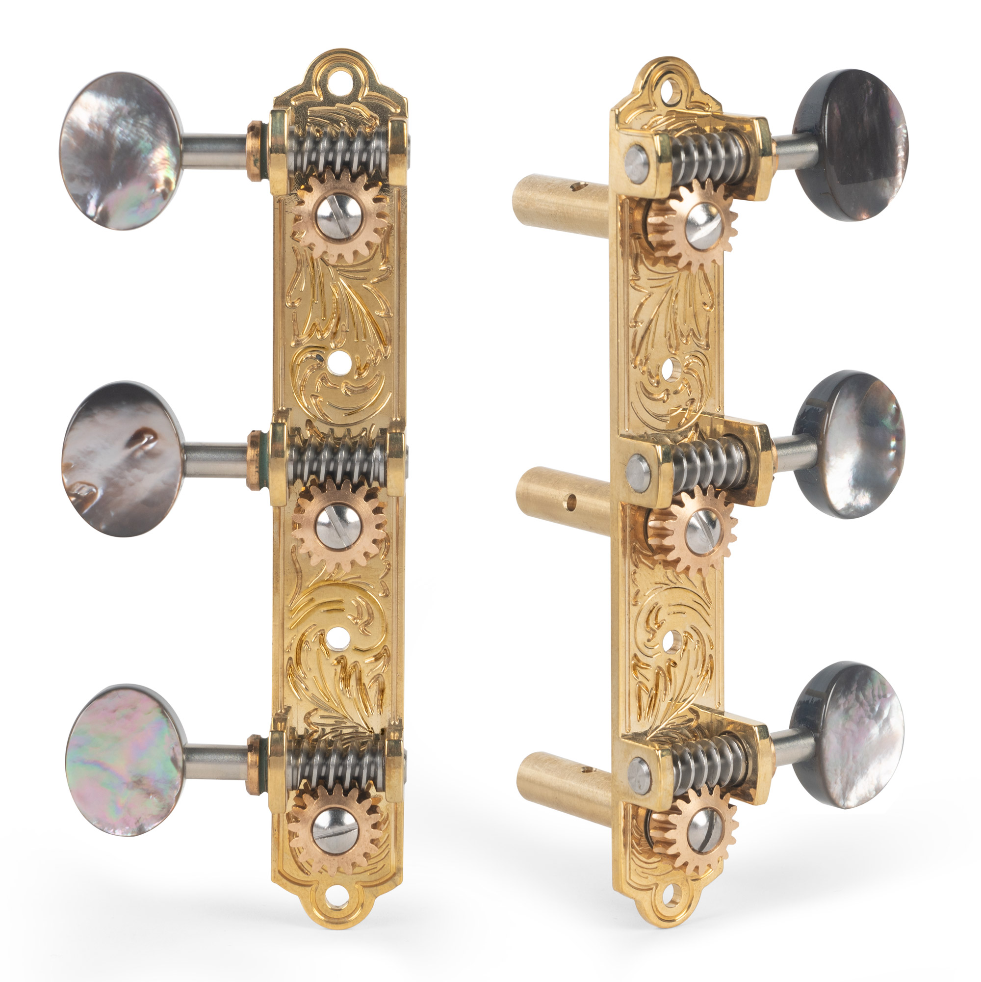 Für maximale Abstimmungsgenauigkeit verfügen unsere Präzisionsplatten- 16:1 Maschinen über dieselben Zahnräder und patentierte Schneckenbuchsen mit Gewinde, die auf allen Waverly-Maschinen zu finden sind. Die Messing-Stringpfosten sind für echte Eleganz und Stil auf polierten Messing-Basisplatten montiert.