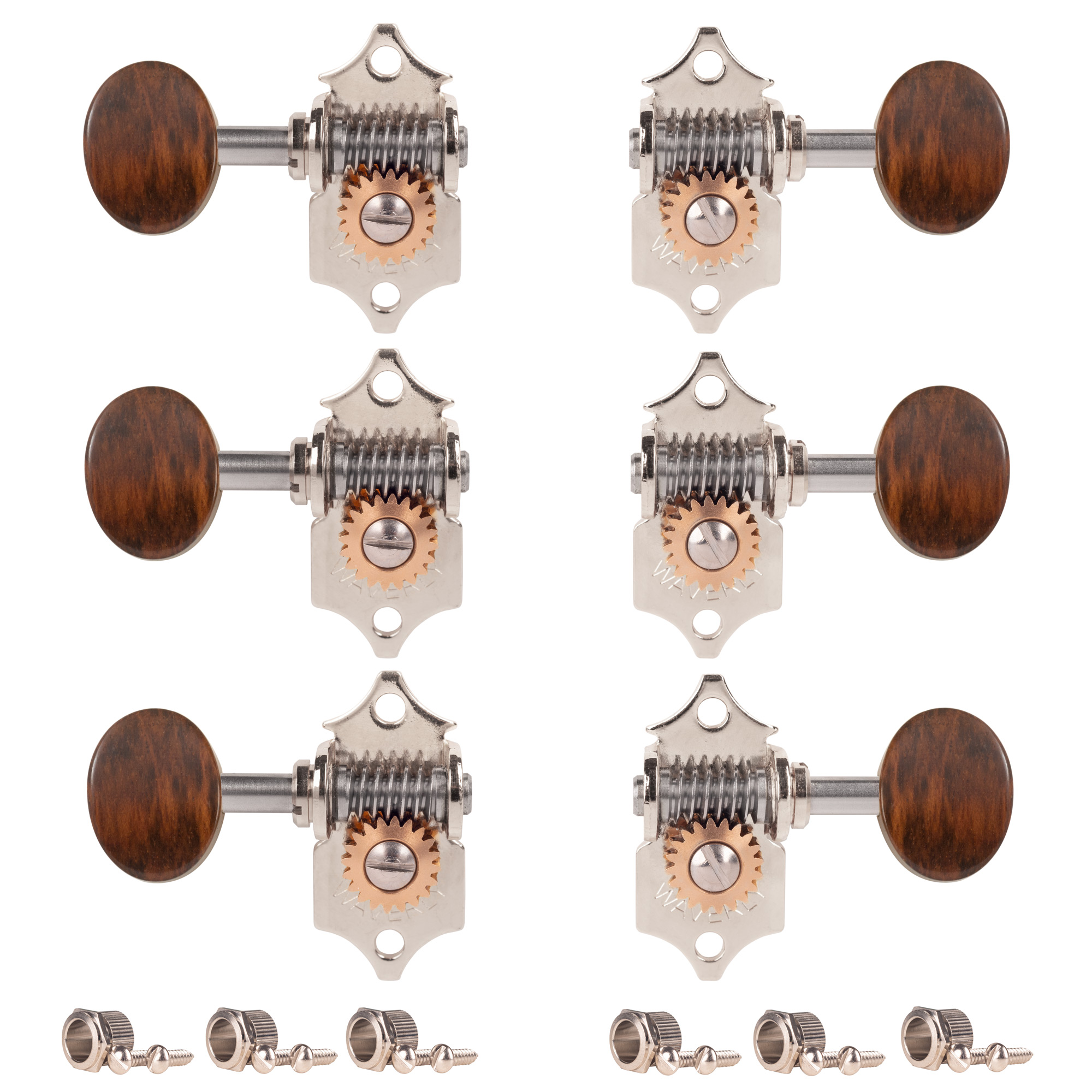 Die stabilen Grundplatten aus Stahl haben die authentische Größe aus den 1930er. Die Stringpfosten sind aus Vintage-Kegelmessing mit einem Durchmesser von 1/4" und gerändelten Sechskantbuchsen aus Messing mit Presspassung für Zapfenlöcher mit einem Durchmesser von 11/32" (8,73 mm). Befestigungsschrauben mit Schlitzkopf runden den Vintage-Look ab. Bei vielen älteren Martins und Gibsons musst du keine zusätzlichen Löcher bohren.