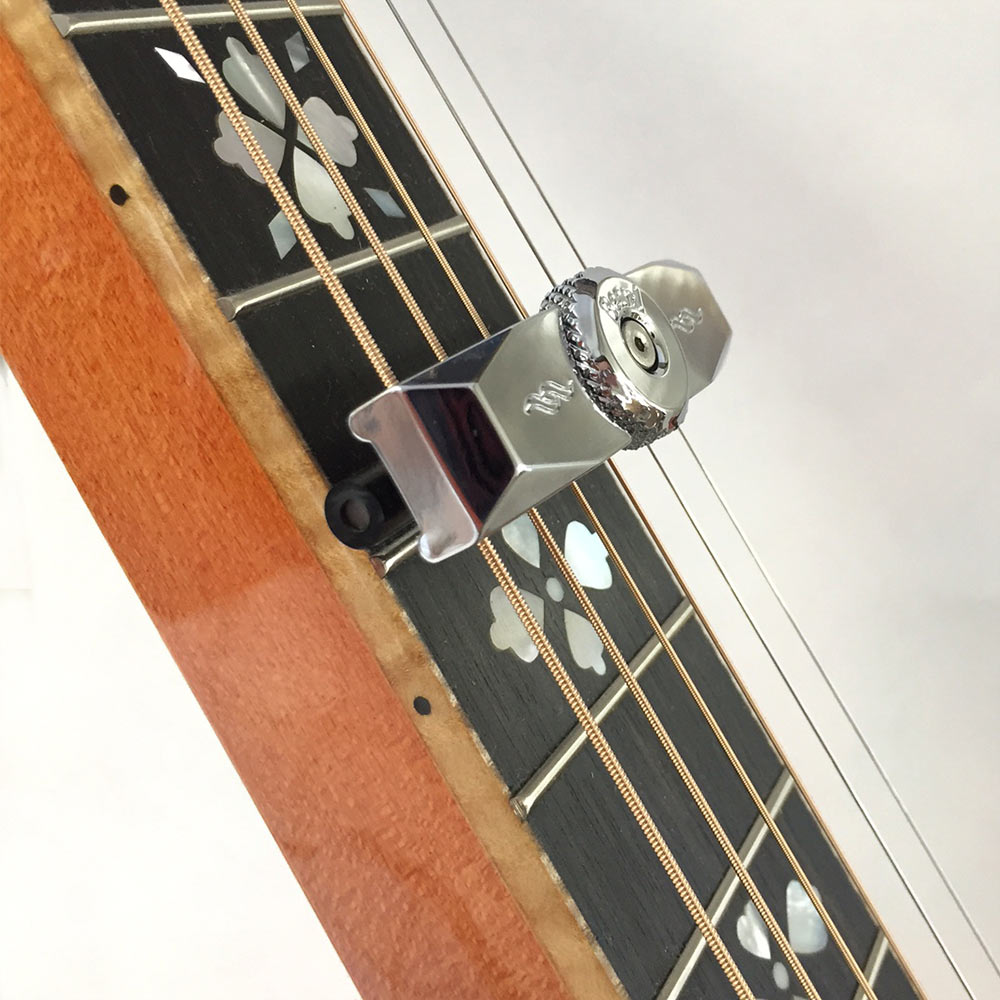 Ein großer Präzisionsspannknopf erleichtert die Einstellung mit einer Hand. Passend für Resonatoren mit 6 und 8 Strängen.