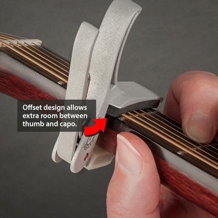 Das weltweit erste Offset-Capo. Das innovative Offset-Design von Grover gibt Ihrer Hand etwas mehr Platz als ein traditionelles Capo – ein echtes Plus bei der Bildung dieses kniffligen B7 er Akkords. Es geht schnell an (und aus). Aus leichtem Aluminium mit mattem Finish.