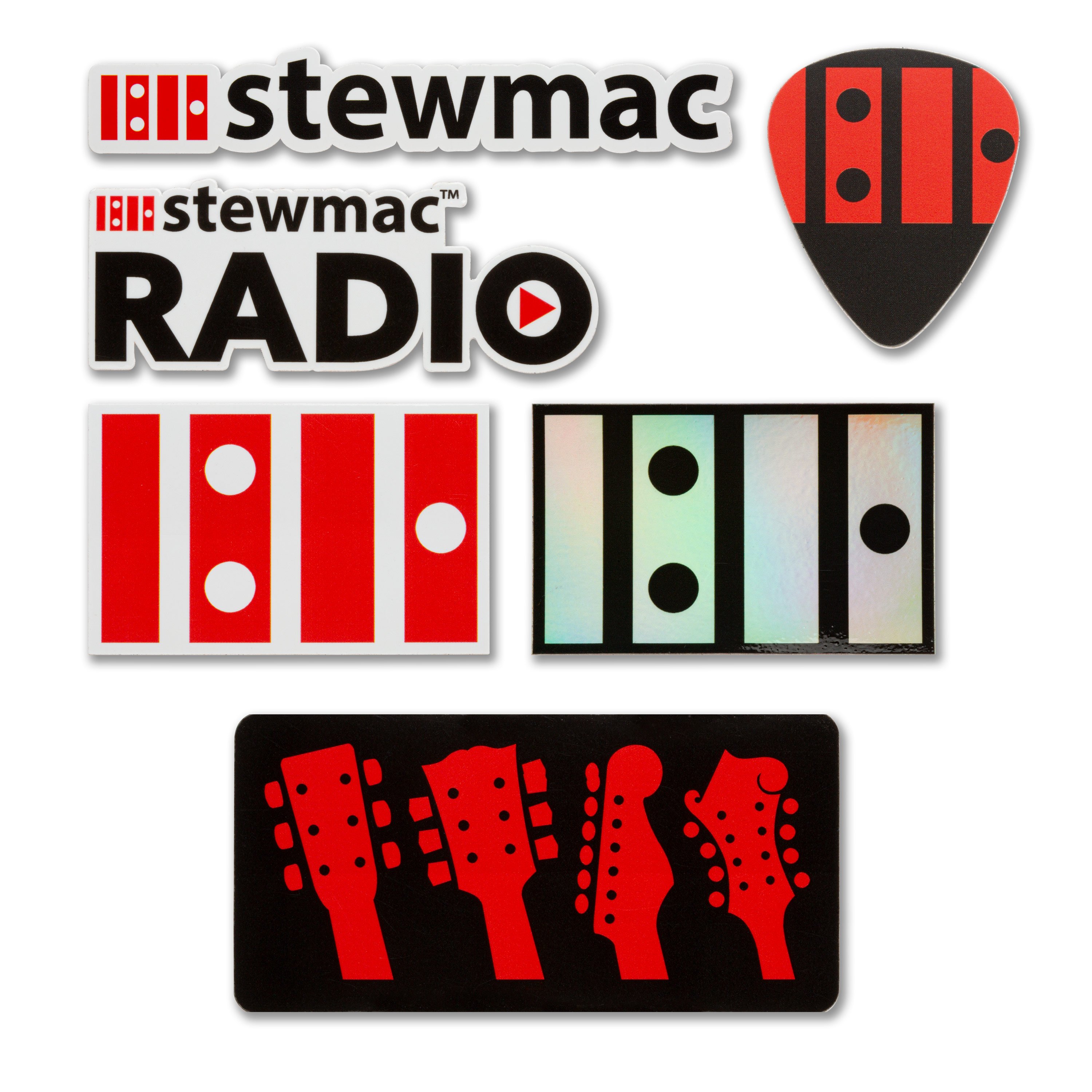 Satz à 6 enthält: 1 Logo-Aufkleber, 1 Pick-Aufkleber, 1 Radio-Aufkleber, 1 Fretboard-Glossaufkleber, 1 Holografischer Fretboard-Aufkleber, 1 Kopfteilaufkleber