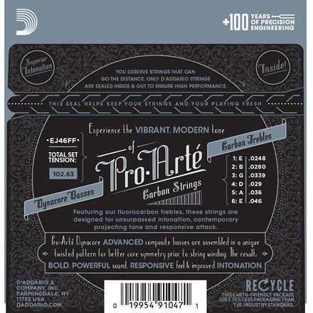 Erleben Sie den lebendigen, projizierenden und modernen Ton der Pro-Arté Carbon-Strings von D'Addario. Unsere Fluorkohlenstoff-Strings wurden nach den anspruchsvollen Spezifikationen unserer Pro-Arté Nylon-Tribles entwickelt und bieten eine unvergleichliche überlegene Intonation, einen reaktionsschnellen Angriff und einen modernen Projizieren-Ton. In Kombination mit den kühnen und leistungsstarken Dynacore-Bässen bieten Pro-Arté Carbons die ideale Kombination aus Spannung und Ton für den klassischen Spieler von heute.- Hervorragende Intonation mit einem reaktionsschnellen Angriff und modernem Projektionston