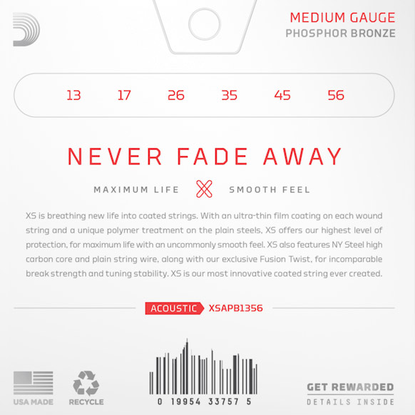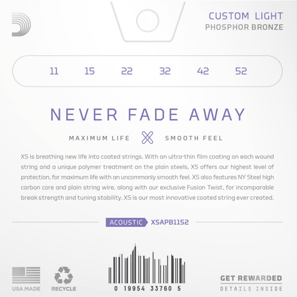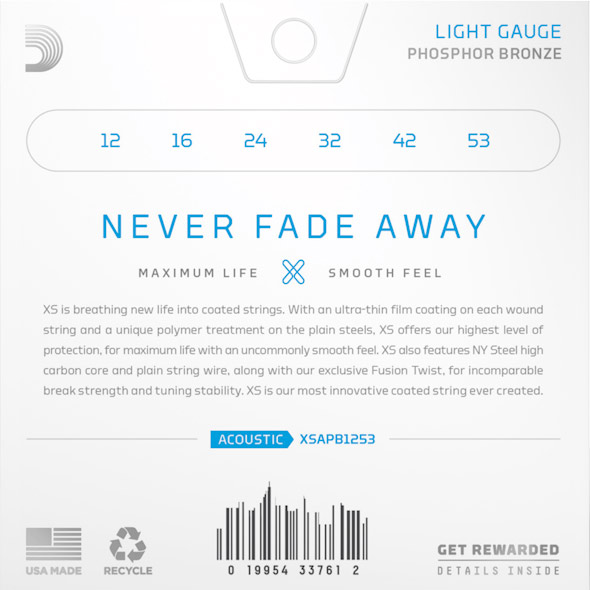 „Von unserem größten Durchbruch in Sachen String-Innovation geboren, haben XS Phosphor Bronze Strings die längste Lebensdauer aller D'Addario Akustikgitarrenstränge. Die XS-Beschichtung verleiht unseren warmen, ausgewogenen Phosphorbronzesträngen maximale Lebensdauer und ein ungewöhnlich glattes Tragegefühl. Mit einem Kern aus NY Steel, einem Phosphorbronze-Wrapdraht und der Fusion Twist-Technologie bieten XS-beschichtete Akustikgitarrenstränge eine unvergleichliche Bruchfestigkeit und Abstimmungsstabilität und eine dramatisch verlängerte Lebensdauer.“