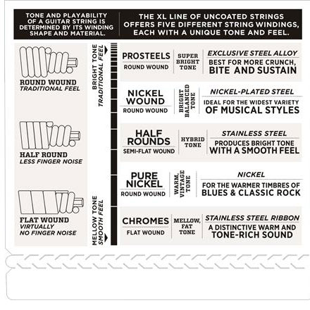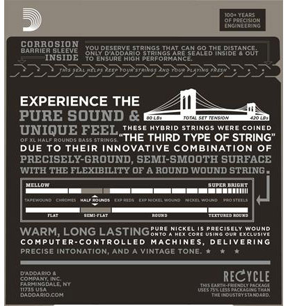 D'Addario Halbrunde Bassstränge werden mit reinem Nickel gewickelt und dann präzisionsgeschliffen, sodass die Außenfläche glatt und halbflach bleibt und gleichzeitig die Flexibilität runder Wundstränge erhalten bleibt. Das exklusive Wärmebehandlungsverfahren von D'Addario stellt sicher, dass die Halbrunden ihre runde Wundhelligkeit beibehalten und erhalten.