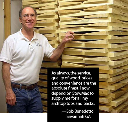 „Wie immer sind Service, Qualität von Holz, Preise und Komfort das Beste. Ich verlasse mich jetzt auf StewMac, um mir all meine Tops und Rückenteile auf dem Archtop zu liefern.“ – Bob Benedetto