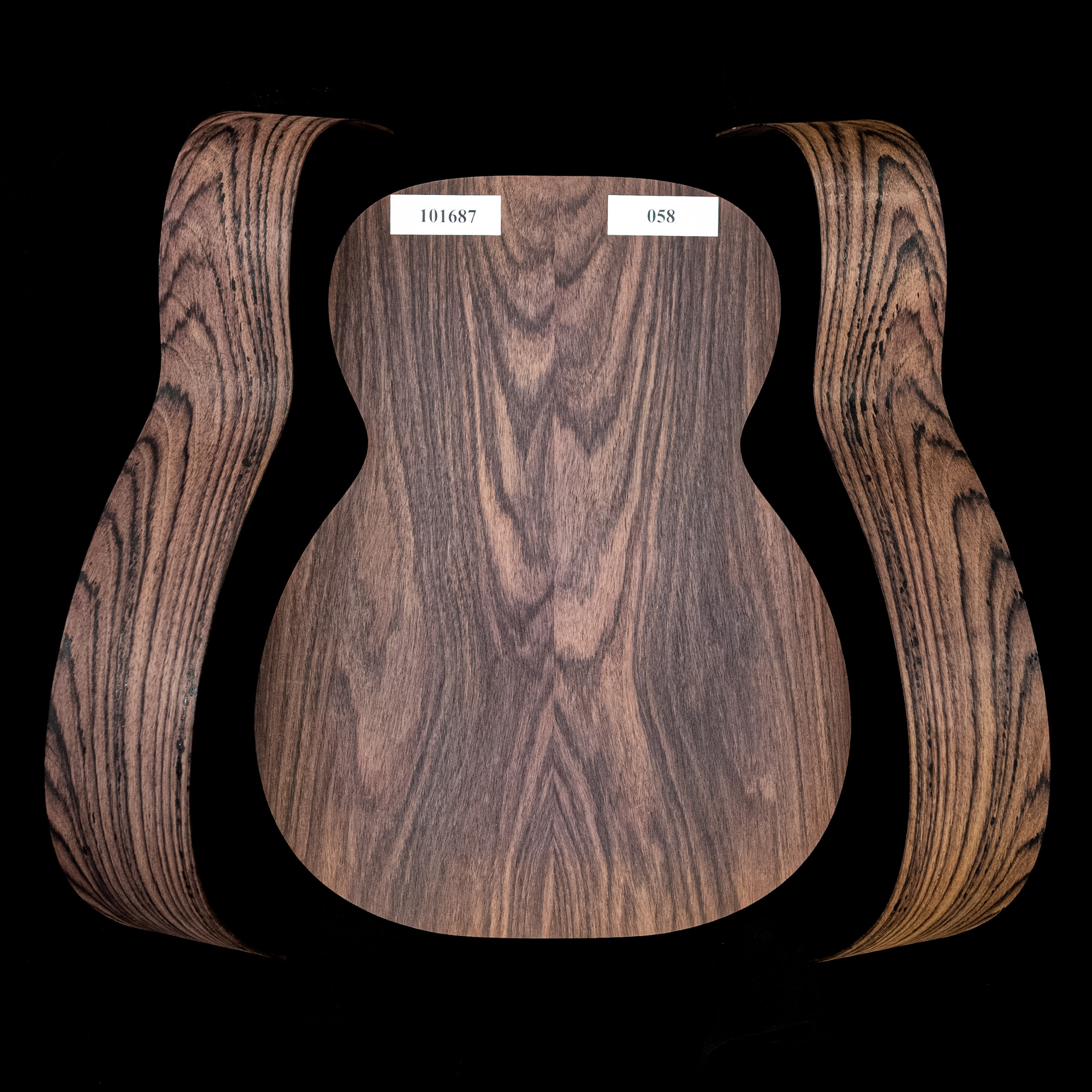 Set mit fertigem Boden + gebogenen Zargen aus Ostindischem Palisander, Wild Grain für OM-Gitarre – 058