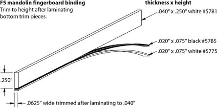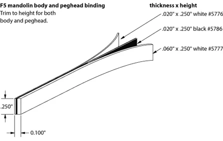 Die folgende Abbildung erklärt die verschiedenen Schichten der Schwarz-Weiß-Binding auf dem Körper, dem Steckkopf und der Fingerauflage einer F5 Mandoline.