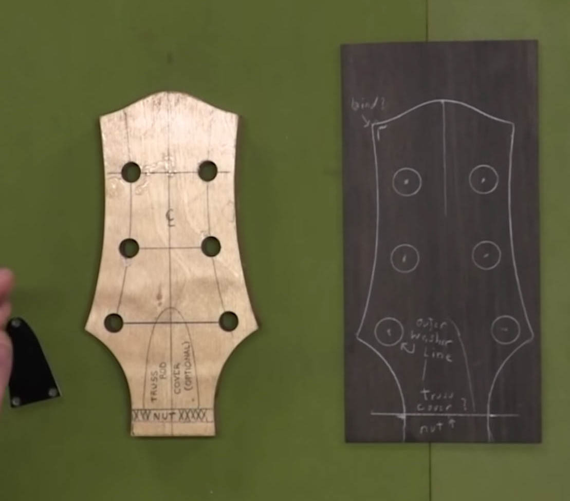 Sie möchten wissen, wo sich Ihre Stimmmechanik-Löcher befinden, und vergessen Sie nicht, auch den Durchmesser der Unterlegscheibe hinzuzufügen. Sie möchten Ihre Mittellinie zeichnen lassen. Verwenden Sie Ihre Bremssättel und erhalten Sie die genauen Messungen. Verfügt Ihre Gitarre über eine Halsstab? Wenn ja, müssen Sie das abbilden. Und Sie möchten sicherstellen, dass Sie wissen, wo sich Ihre Nuss befindet, und das berücksichtigen. Ihre Kopfplatte-Vorlage sollte so detailliert wie möglich sein.