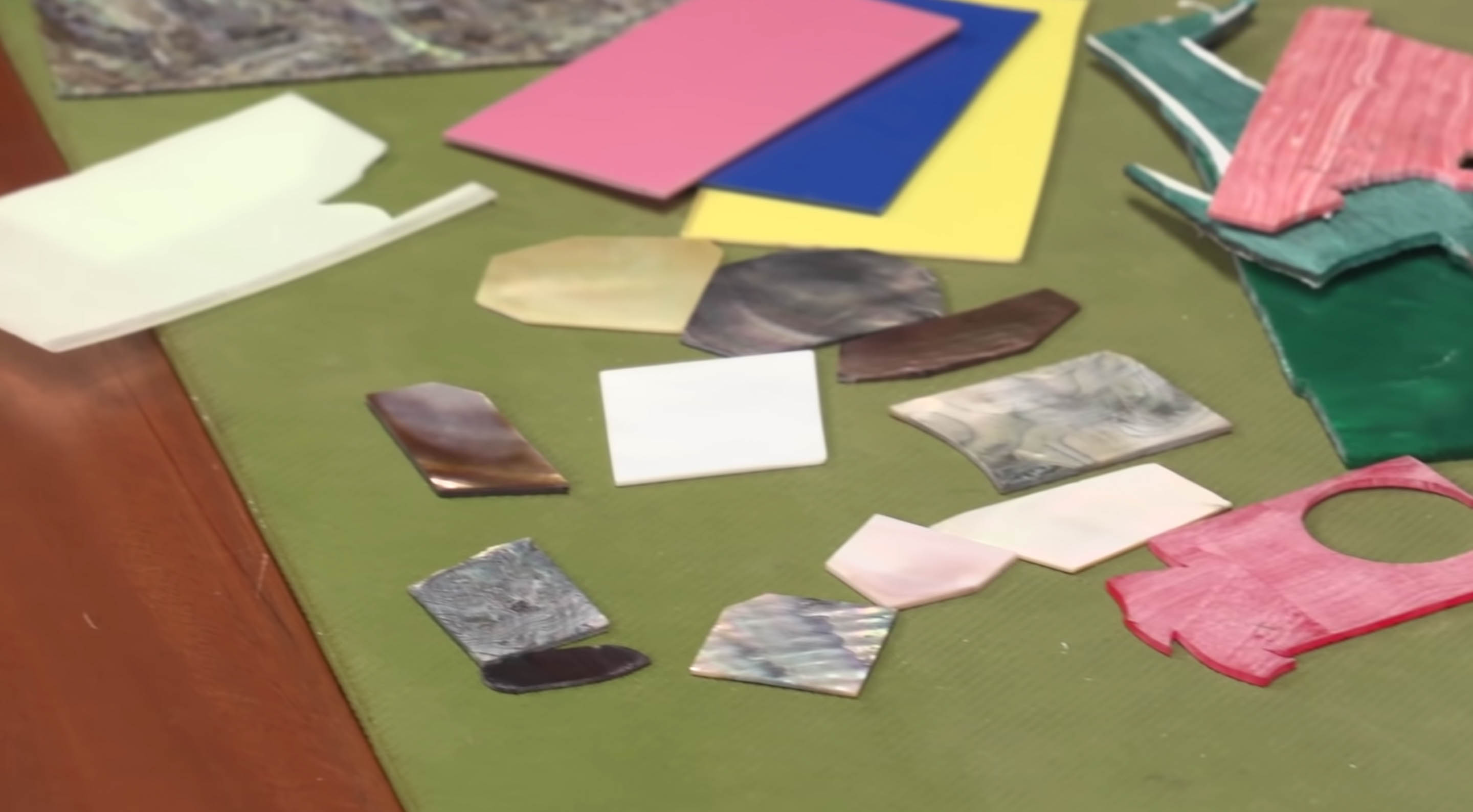 Für dieses Projekt werden wir Mutter der Perle und ein rotes Stück Atlante verwenden. Wir werden einen roten Atlante für dieses klassische Griffbrett-Bild verwenden, und wir werden Mother-of-Pearl für den Textteil unseres Logos verwenden. Wir werden auch Perlmuttpunkte verwenden, um diese Fret-Positionsmarkierungen auf dem Griffbrett-Bild zu erstellen.