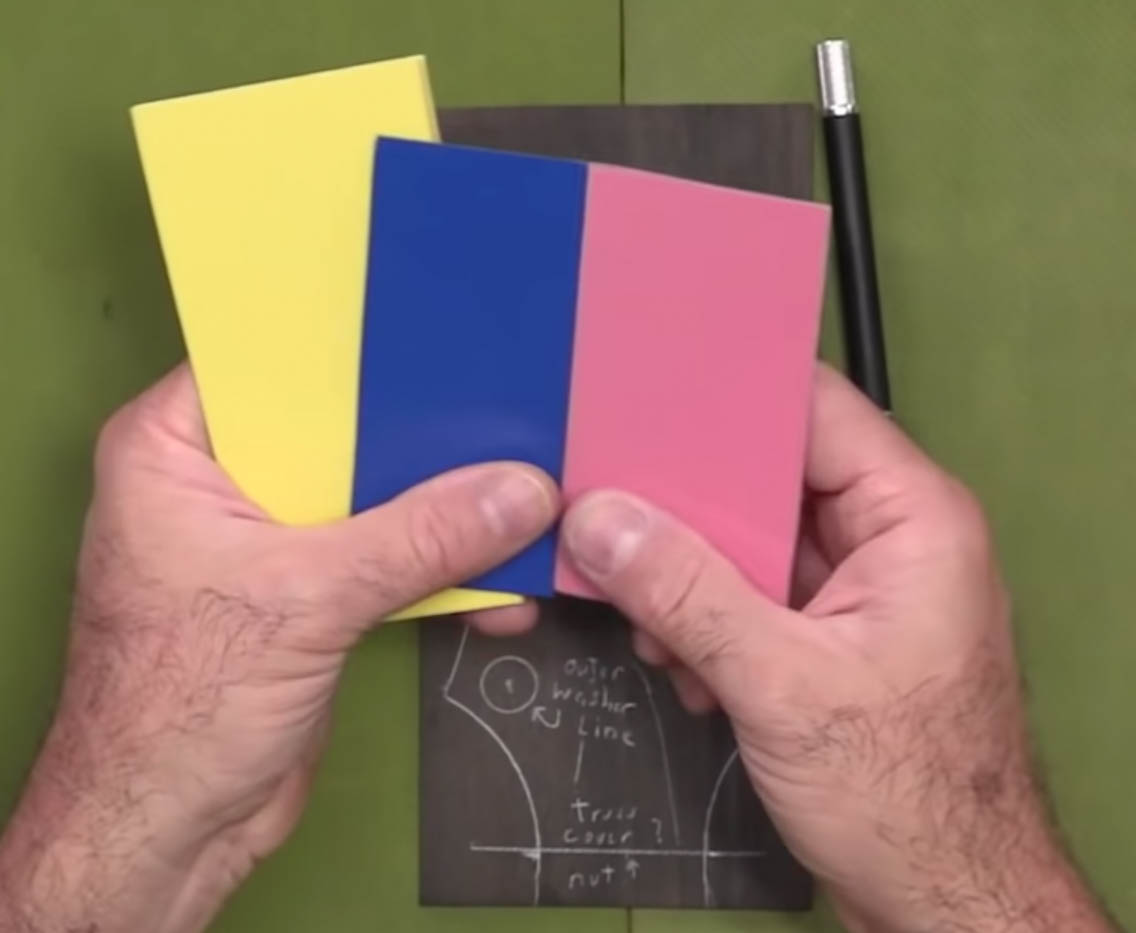PRO TIPP: Wenn ich Holz als Griffbretteinlage verwende, beschichte ich das Holz mit super glue oben und unten, bevor ich mit dem Schneiden beginne. Es hilft, das Holz zu verfestigen, sodass beim Schneiden weniger Ausfransen auftreten. Wälder sind natürlich sehr porös und werden sehr schnell das übernehmen, was um sie herum passiert. Sie müssen also sehr vorsichtig sein, wenn Sie Holz verwenden. Hervorragend zu verwenden, aber ein wenig andere Regeln.