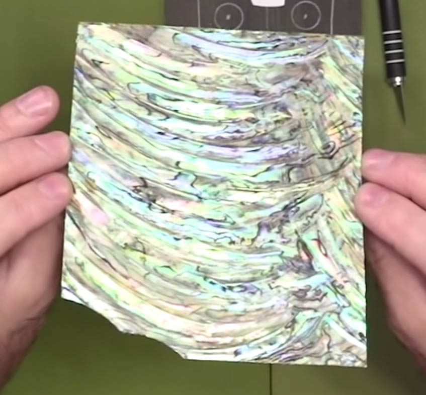 Es gibt ein wirklich tolles Material, das ich persönlich liebe: Abalam. Dies ist ein mehrschichtiges Abalone, das aus wärmebehandelten Abalone-Scheiben besteht. Dann kleben sie es zusammen und klemmen es ein und wickeln es mit einem Blatt ab, das etwa 0,050" bis 0,060" dick ist. Sie neigt dazu, sehr gut zusammenzubleiben. Es bricht nicht sehr aus und bleibt wirklich bunt, wirklich hübsch.