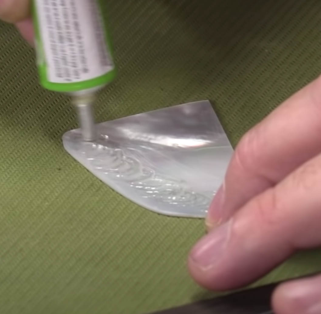 Zement der TesterJetzt werden wir auf unserem Griffbretteinlage-Material finden, wo wir unser Muster anbringen möchten. Mein Lieblingskleber zum Ablegen des Papiermusters ist Testors Cement. Der große Vorteil von Testors Cement ist, dass es alles enthält, was ich verwende. Ich verwende dies für jedes einzelne Kleben, das ich auf fast jedem Material mache, das ich verwende. Wir nehmen dieses Stück Perlmutt und finden den Ort, den wir für den Skriptteil unseres Logos benötigen.
